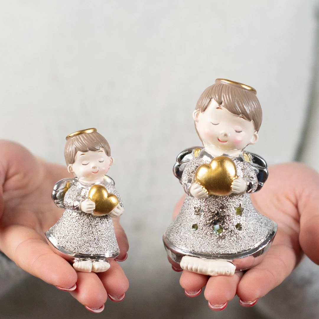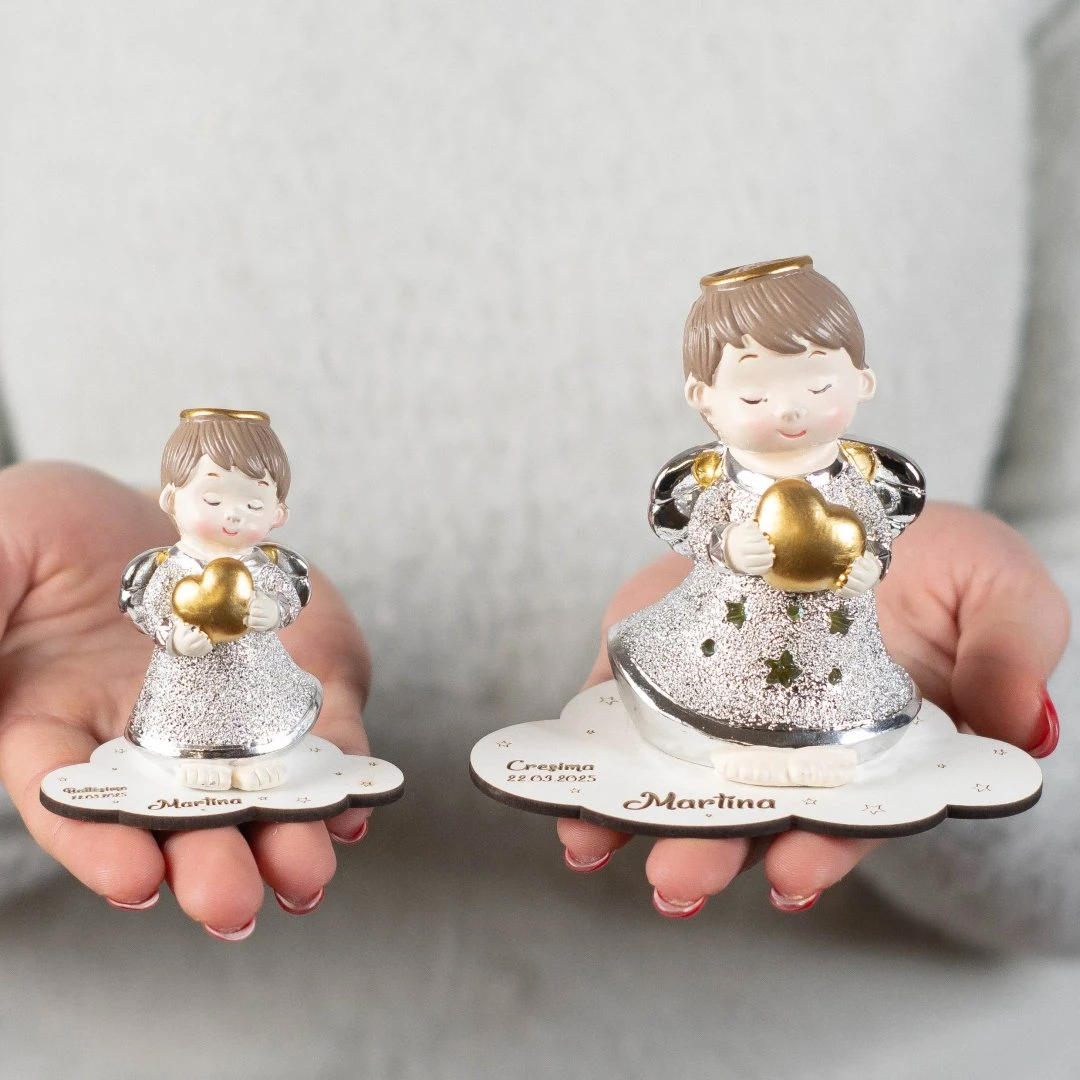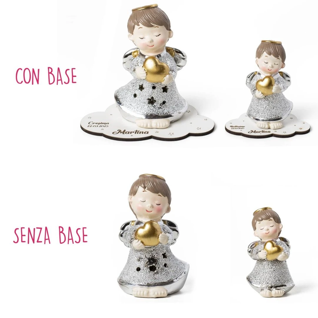 Bellissime Bomboniere 2026, Linea Coeur Angeli argentati con cuore oro in resina, Luce LED e statuina. Per ogni prodotto ci sono 2 modelli assortiti tra loro. Prezzo cadauno. Prodotto Artigianale. La base personalizzata è inclusa solo se acquistata, altrimenti l'angelo arriva sprovvisto di base.