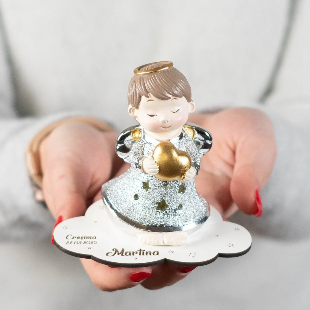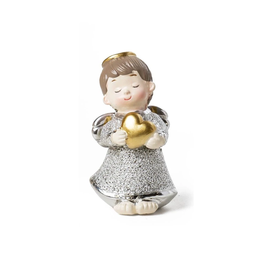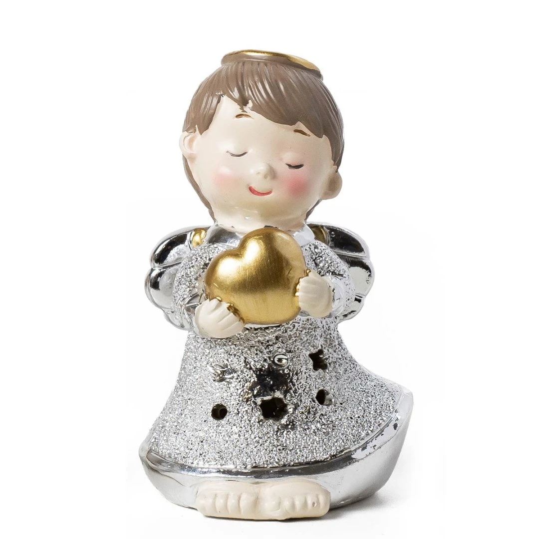 Bellissime Bomboniere 2026, Linea Coeur Angeli argentati con cuore oro in resina, Luce LED e statuina. Per ogni prodotto ci sono 2 modelli assortiti tra loro. Prezzo cadauno. Prodotto Artigianale. La base personalizzata è inclusa solo se acquistata, altrimenti l'angelo arriva sprovvisto di base.