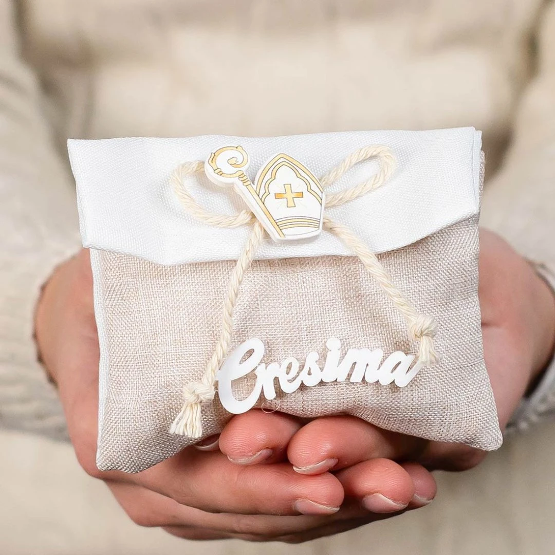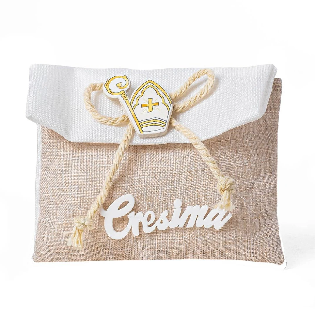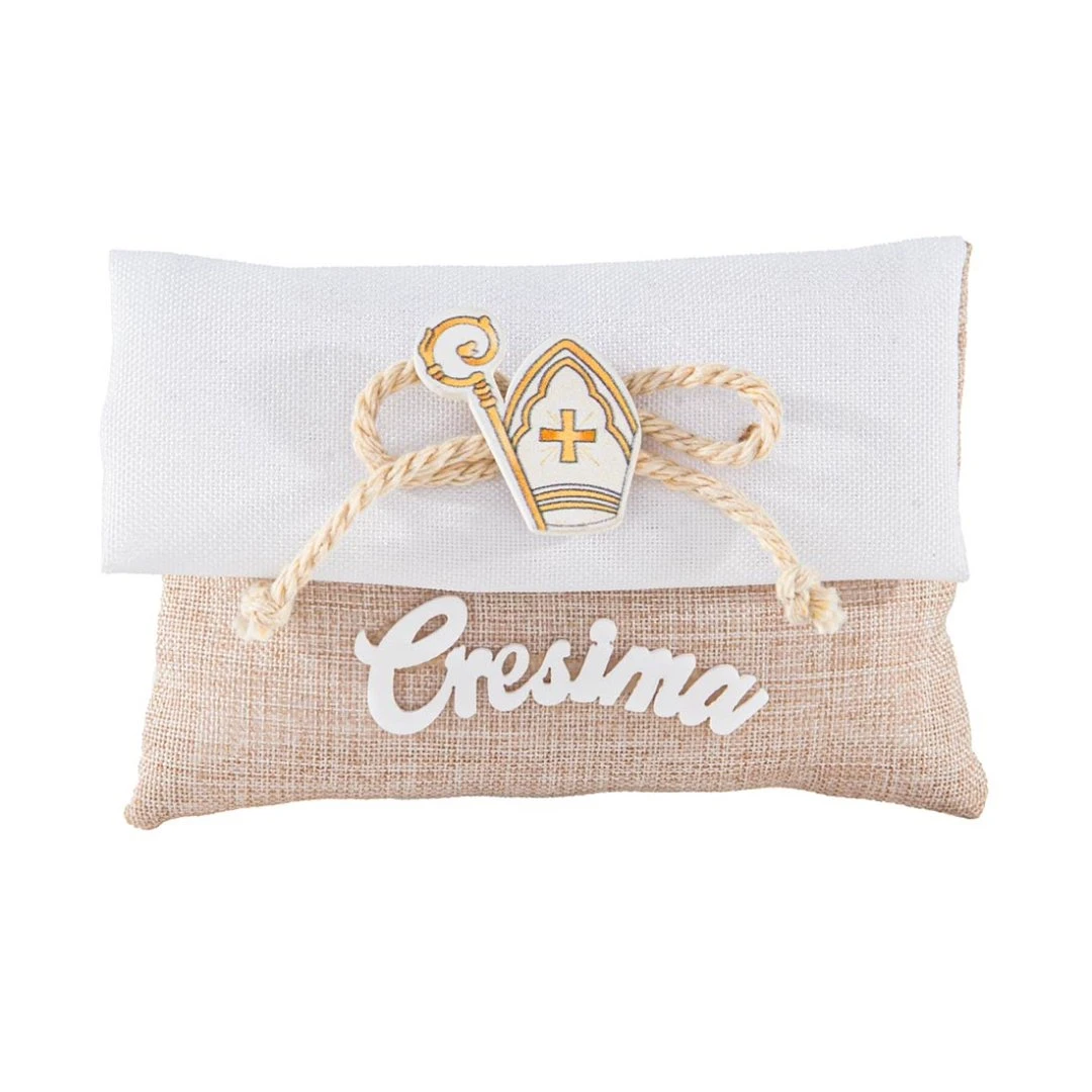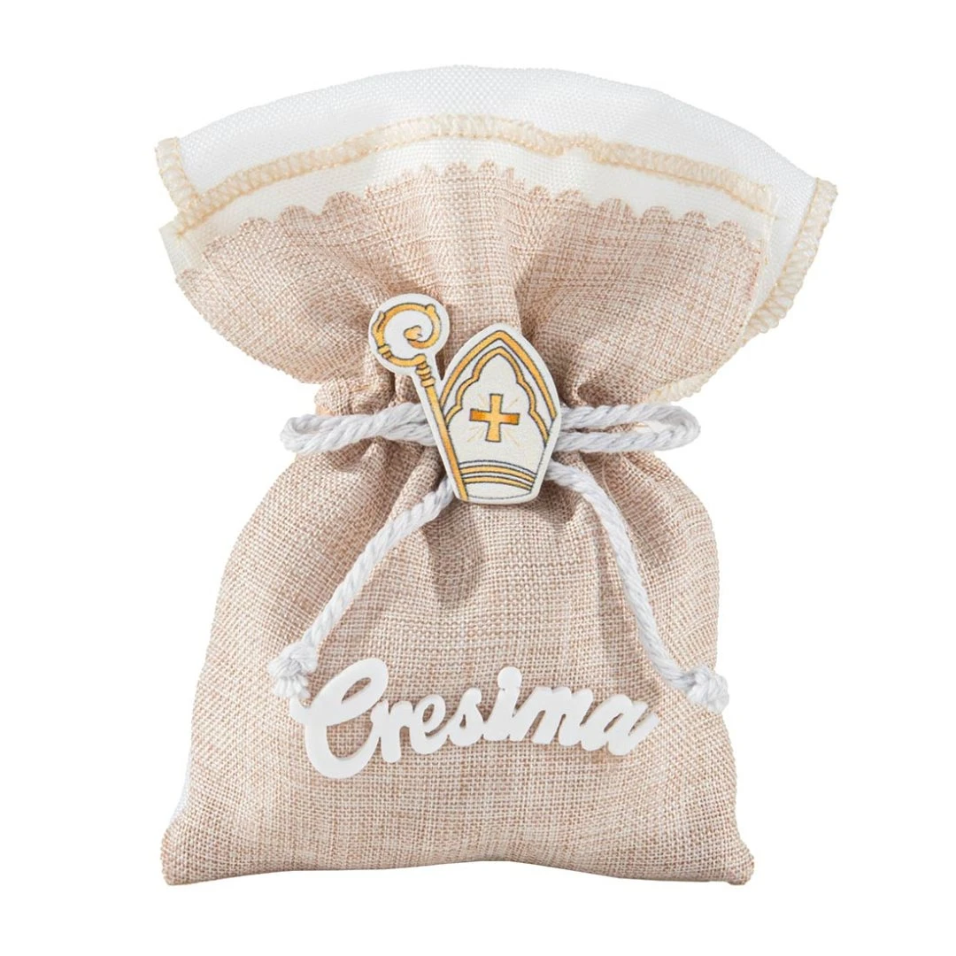Elegante sacchettino portaconfetti della Collezione Memento, realizzato in tessuto effetto juta naturale con dettagli bianchi. Decorato con applicazione in legno con cappello e bastone della Cresima e scritta “Cresima”, è una bomboniera semplice e raffinata, perfetta per celebrare la Santa Cresima. Disponibili due modelli. Prezzo cadauno.