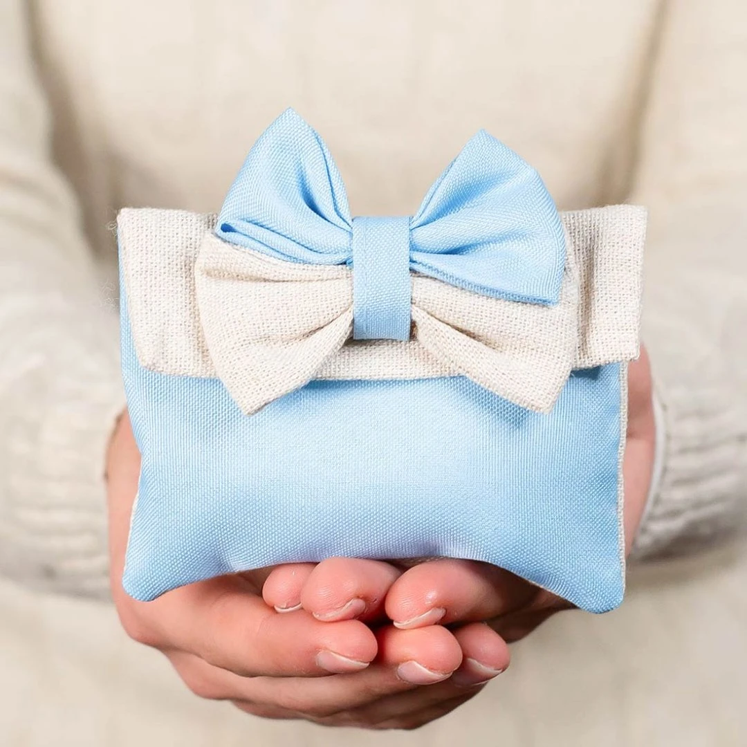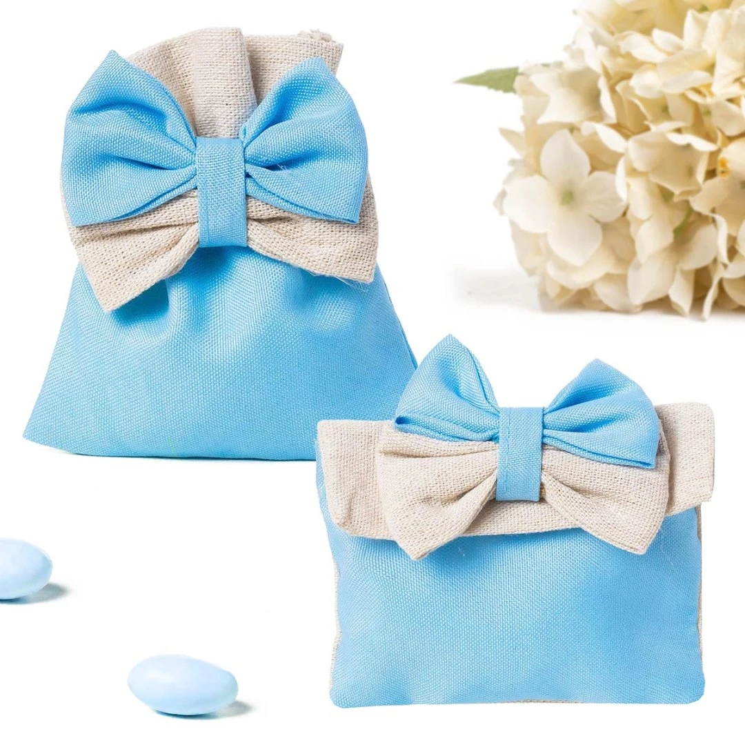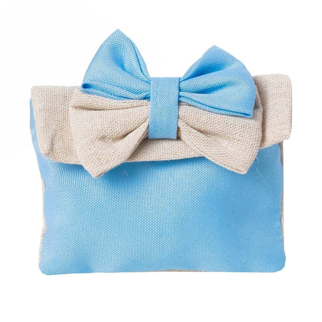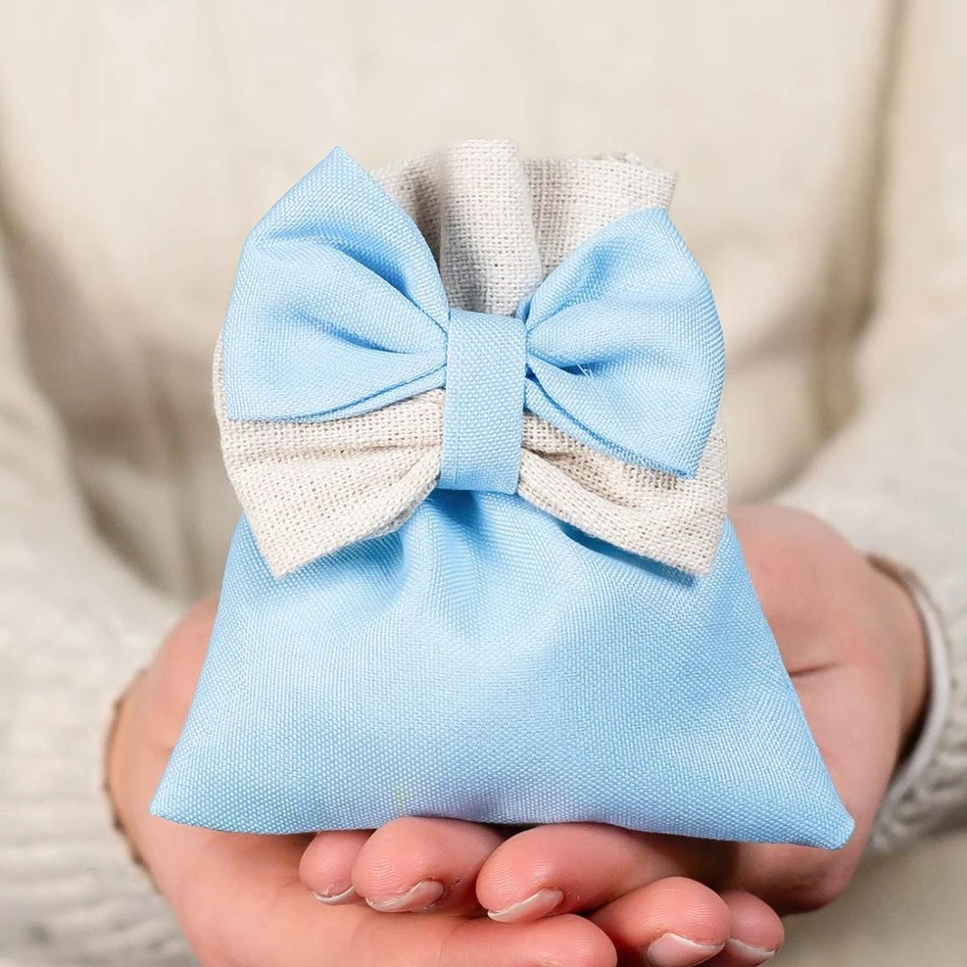 Delicato sacchettino portaconfetti della Linea Muffin, realizzato in cotone celeste con fiocco doppio nei toni celeste e color juta. Uno stile naturale e raffinato, ideale per battesimo, nascita o baby shower. Prodotto artigianale. Disponibili due modelli. Prezzo cadauno.