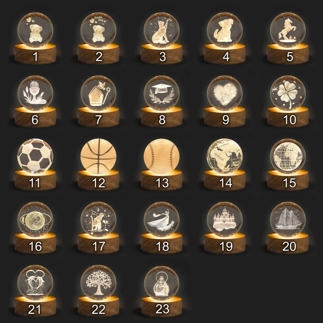 Bomboniere 2026 Sfera in vetro con incisione interna in 3D, su base in legno a LED e con possibilità di personalizzare la base in plexiglass a specchio. Misura: sfera Ø 6 cm | h totale 9 cm.