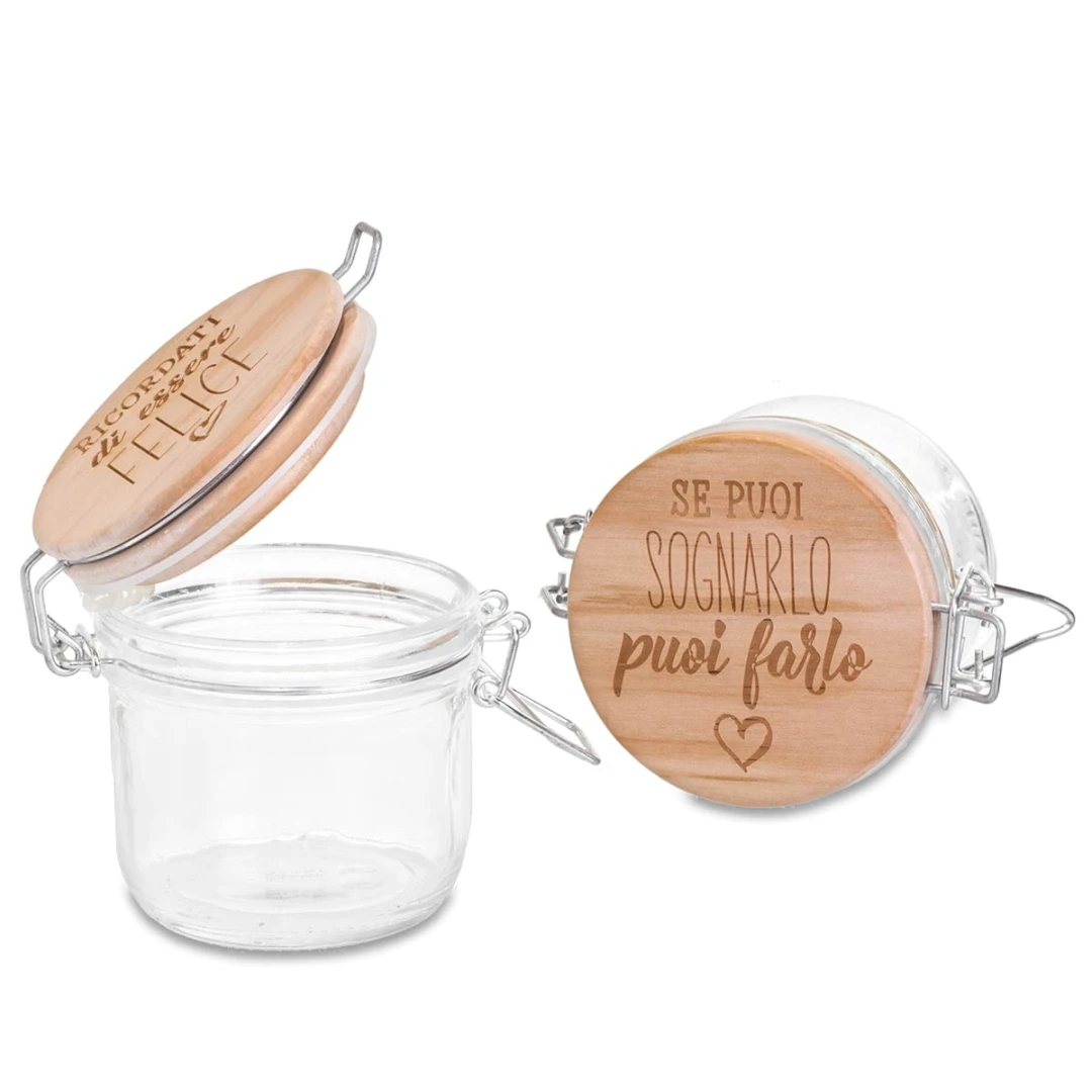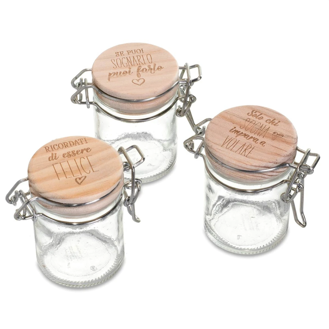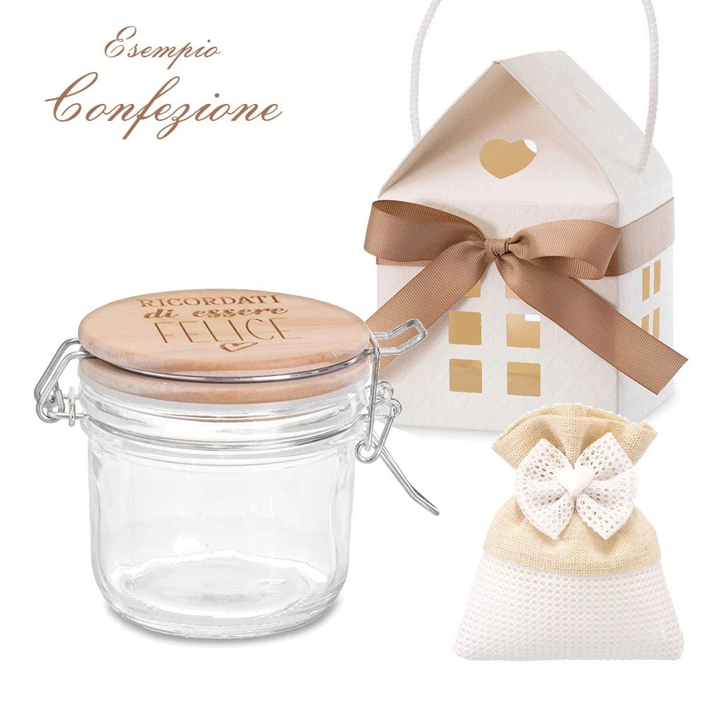 Idea Bomboniera Originale 2026, simpatici barattolini, vasetti in vetro con tappo di legno che possono essere utilizzati come porta-confetti, porta-spezie, contenitori per marmellata, vasetti miele.
