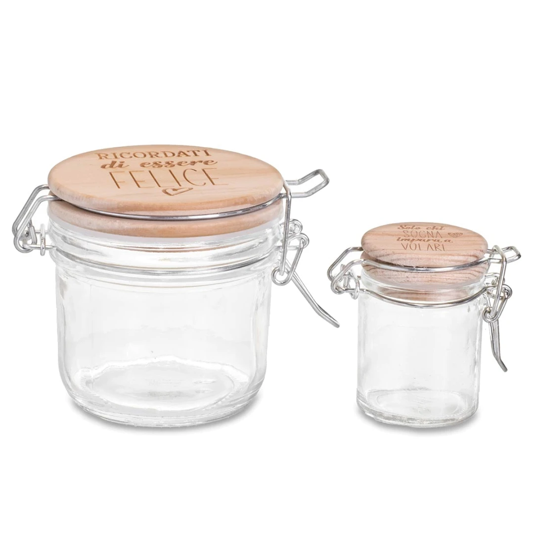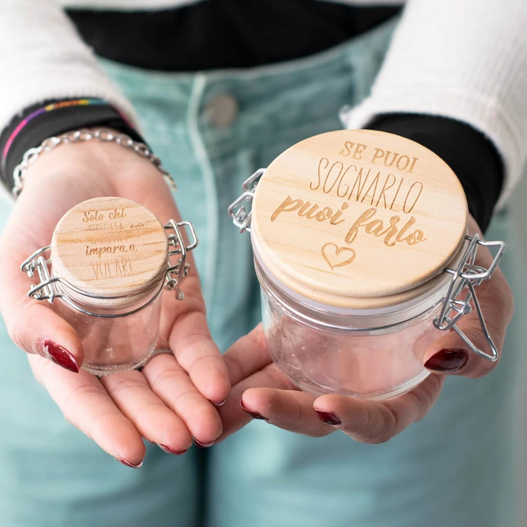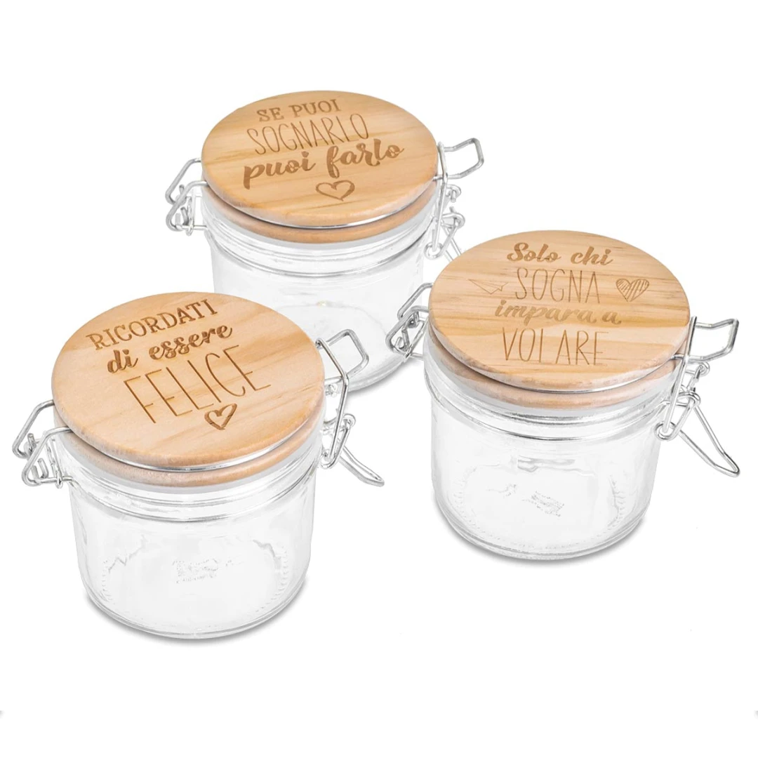 Idea Bomboniera Originale 2026, simpatici barattolini, vasetti in vetro con tappo di legno che possono essere utilizzati come porta-confetti, porta-spezie, contenitori per marmellata, vasetti miele.