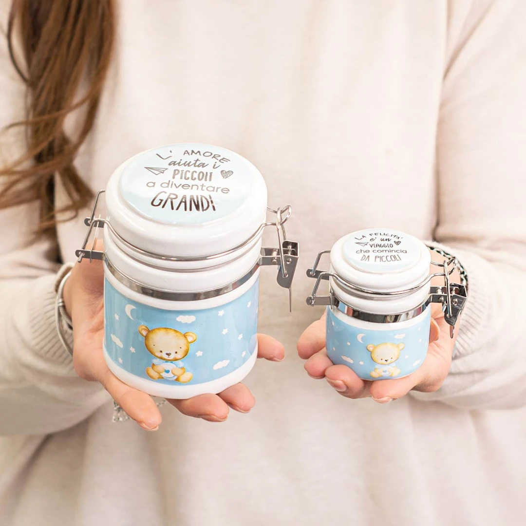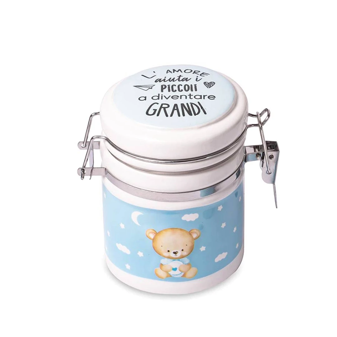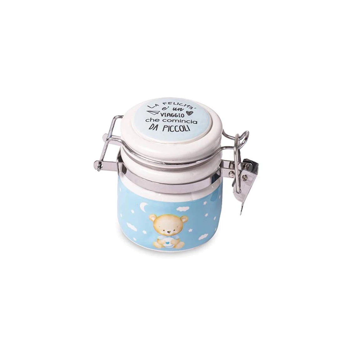 Bellissime Bomboniere 2026 per Battesimo e Nascita Bimbo, Linea Baby Box, Barattolini ermetici celesti in porcellana con orsetto e decoro frase su coperchio. La versione Standard include il cucchiaino. Prezzo cadauno. Prodotto Artigianale.