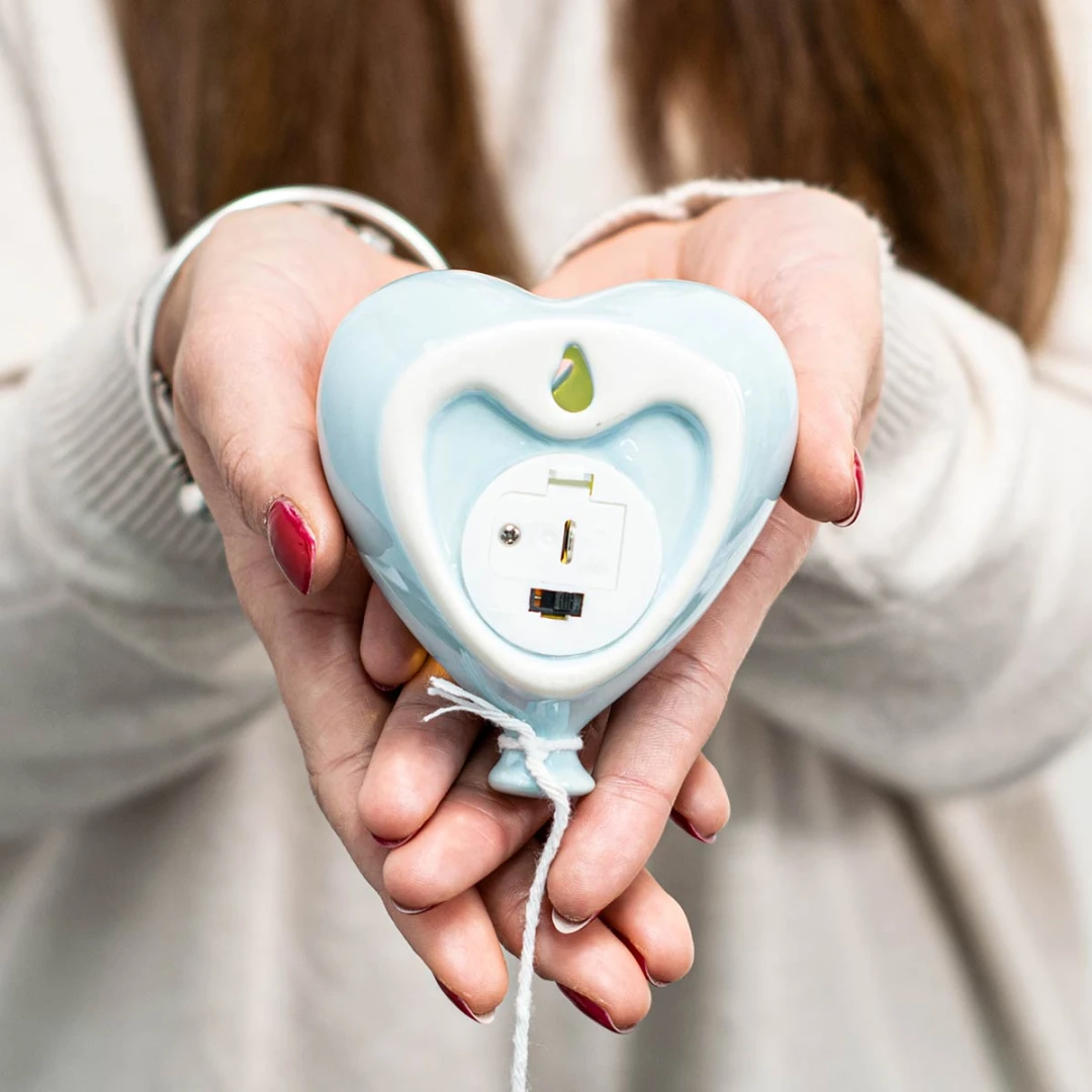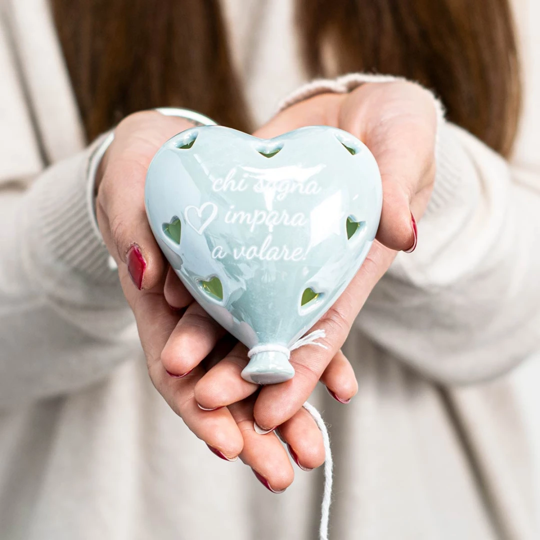 Bellissime Bomboniere Battesimo e Nascita Maschio 2026, Linea Volo Baby, Palloncino Celeste con cuori LED e scritte in ceramica con un cordoncino alla base. Prodotto Artigianale. Misura: 9 x 8 cm | h 5 cm pile non comprese