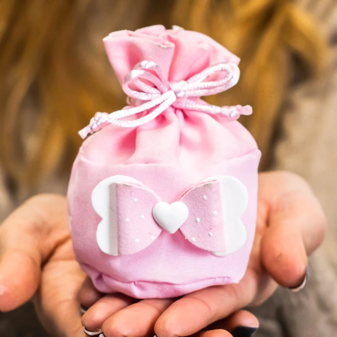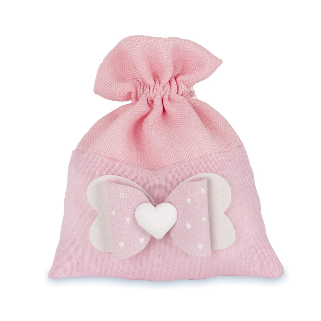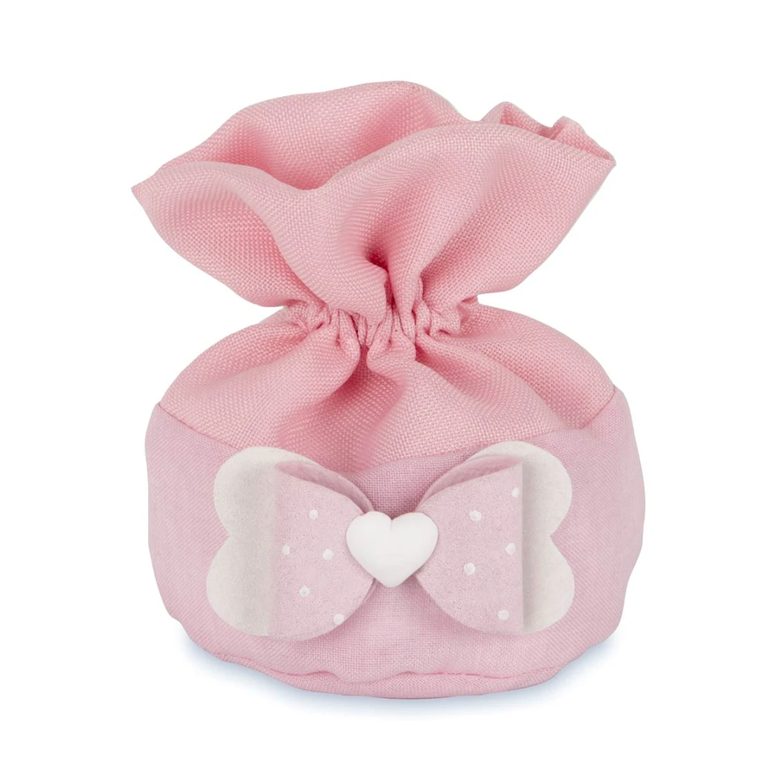 Bomboniere 2026 Battesimo e Nascita Bimba Linea POINT Sacchettini rosa con papillon, gessetto cuore e pois. scegli il modello tra piatto e tondo, il Prezzo si riferisce a 1 sacchetto. Prodotto Artigianale.