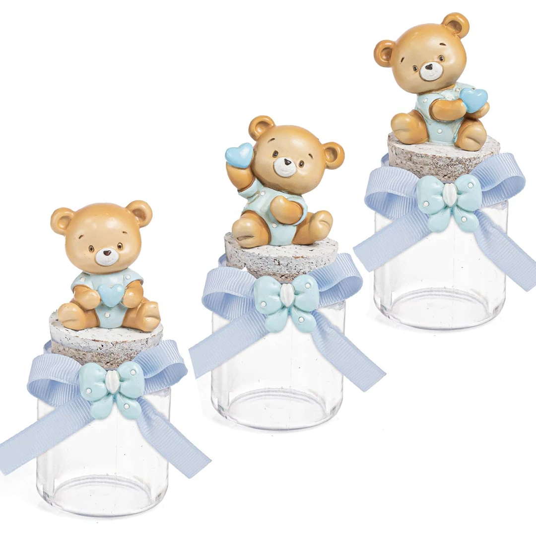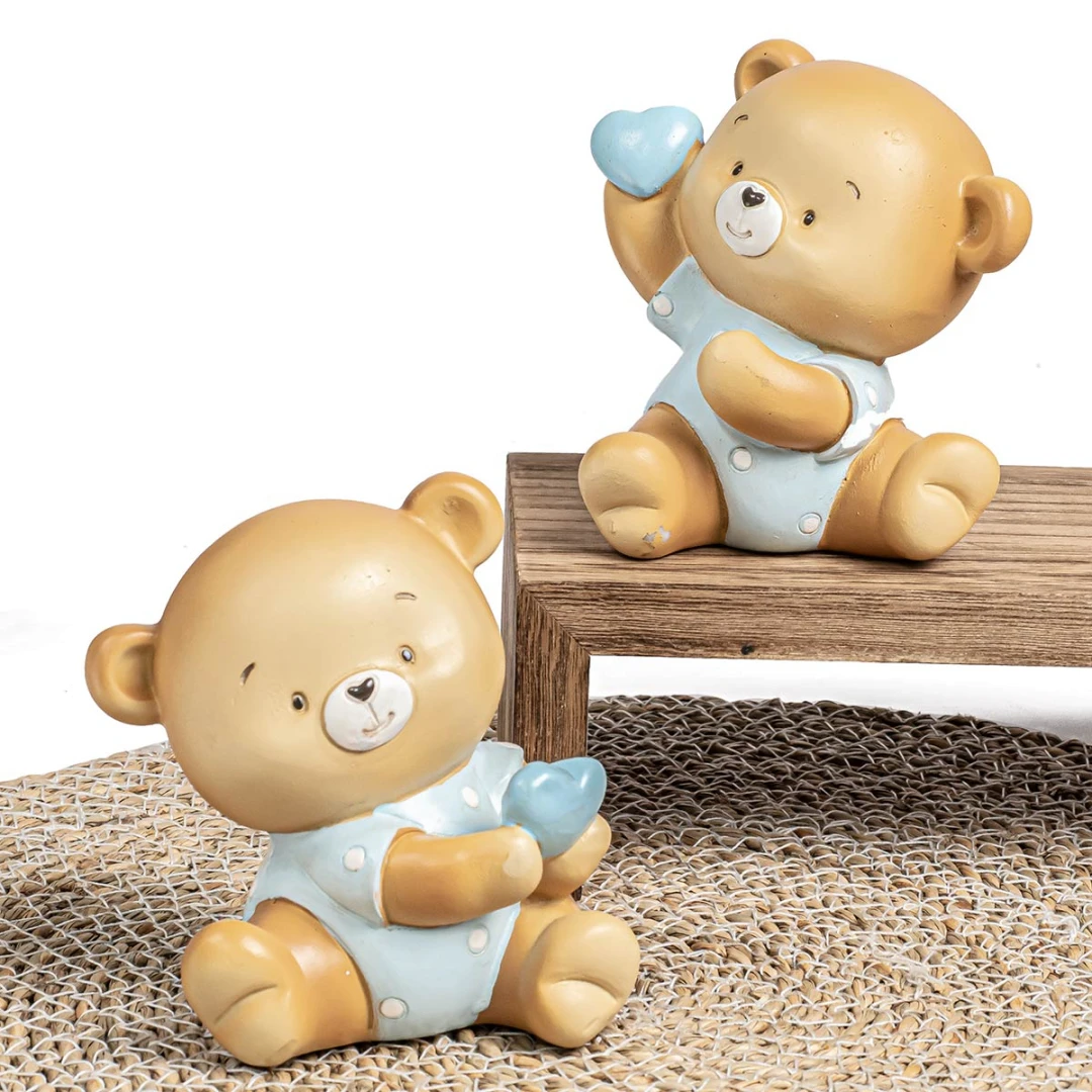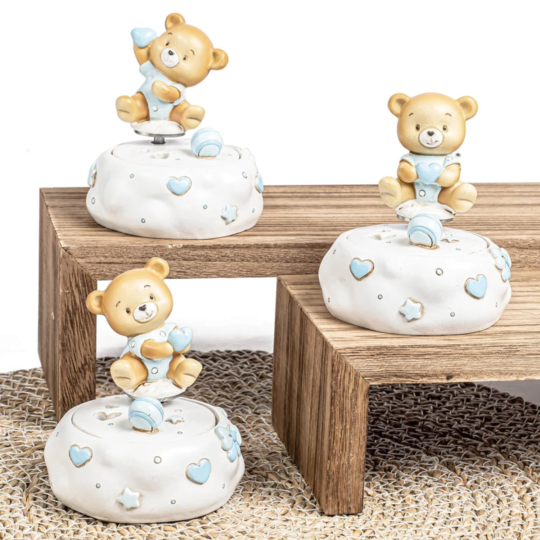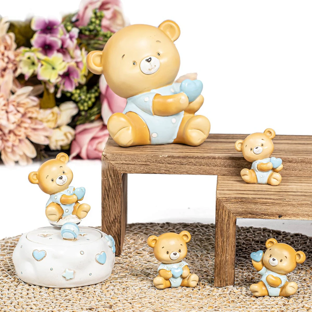 Bellissime Bomboniere 2026 per battesimo e nascita maschio, Orsetto salvadanaio, Barattolino Orsetto, Statuetta Orsetto e Carillon Orsetto. Per ogni prodotto ci sono 2 modelli assortiti tra loro (tranne il salvadanaio che sono 2). Prezzo cadauno. Prodotto Artigianale.
