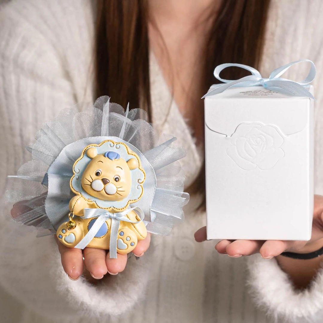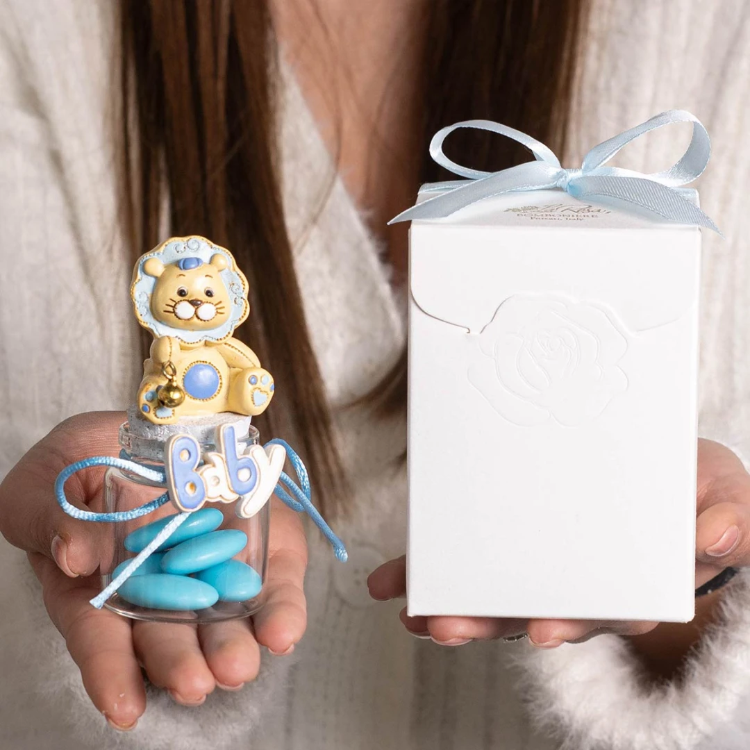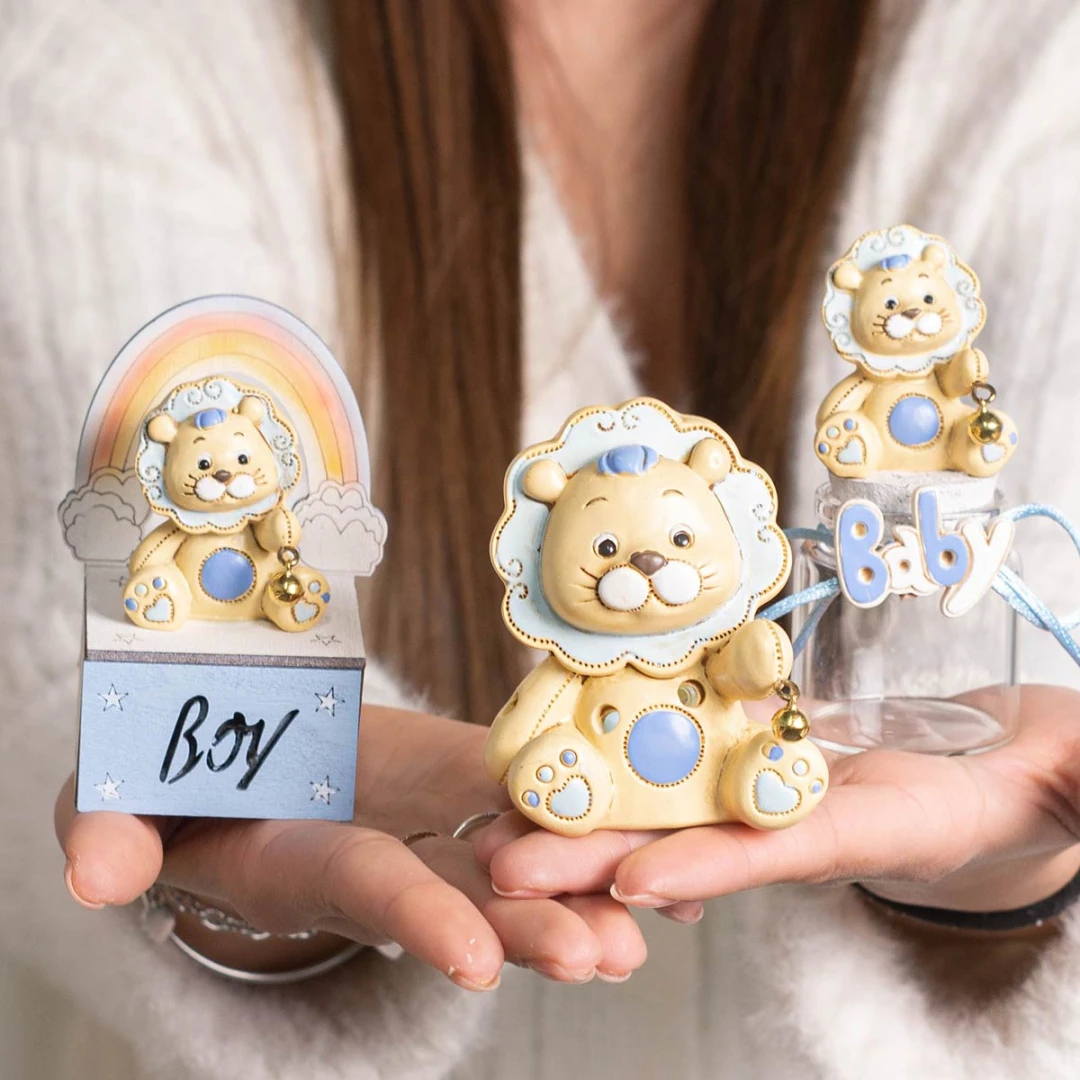 Bellissime Bomboniere 2026 per battesimo e nascita maschio, Leoncino Led, Barattolino Leoncino e Scatolina Leoncino con cassettino ed arcobaleno. Per ogni prodotto ci sono 2 modelli assortiti tra loro. Prezzo cadauno. Prodotto Artigianale.