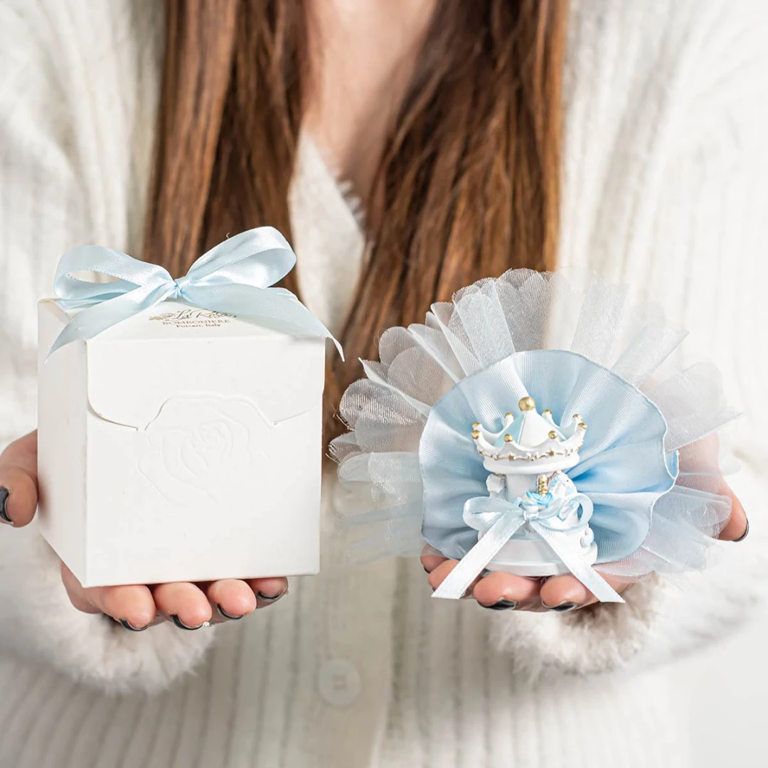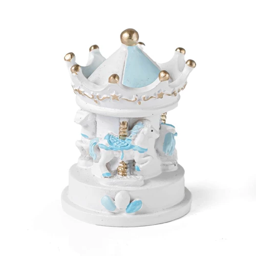 Bellissime Bomboniere 2026 per battesimo e nascita maschio, Statuetta con Giostra cavallini con dettagli celesti e bianchi in resina. Prezzo cadauno. Prodotto Artigianale. misura: 5,5 x 4 cm