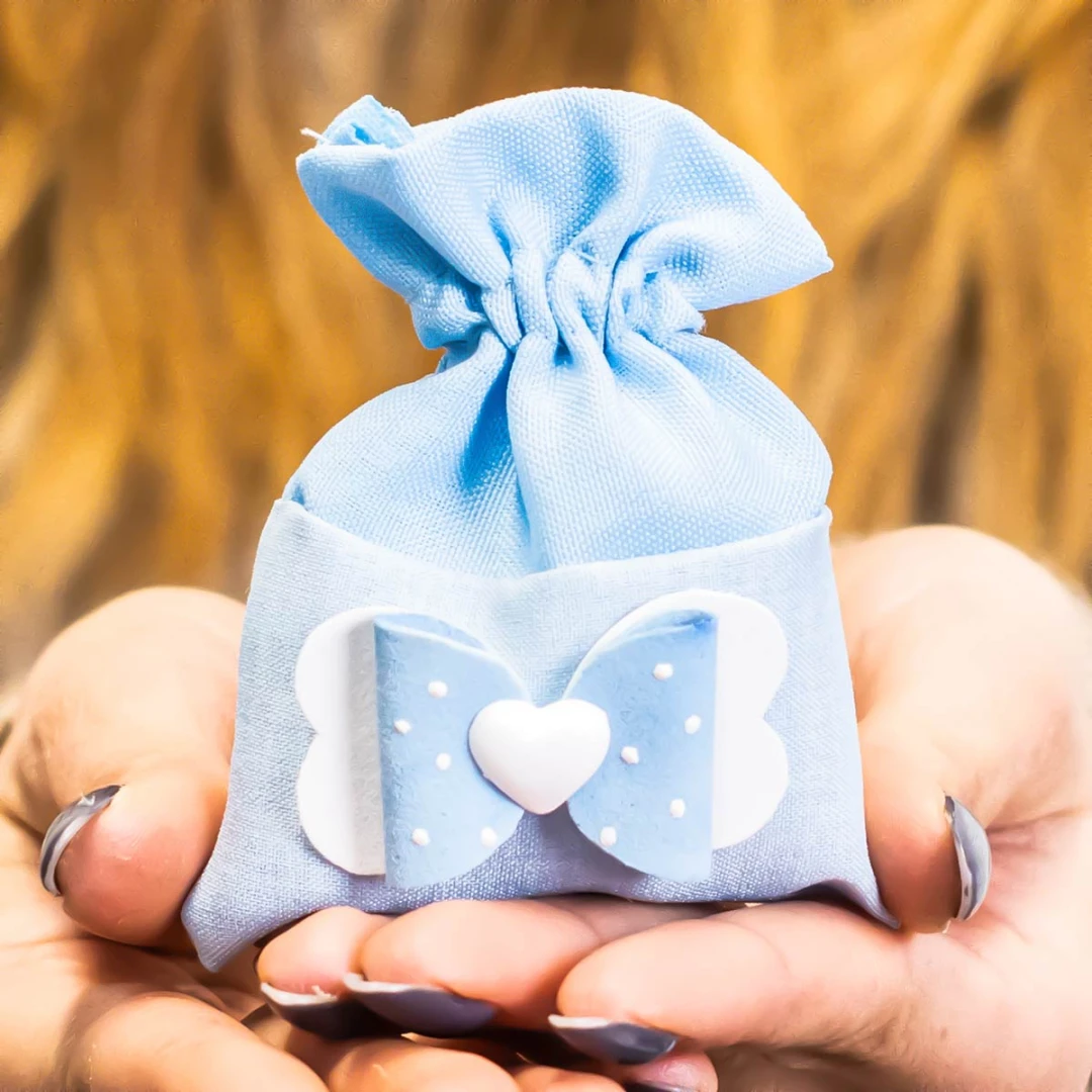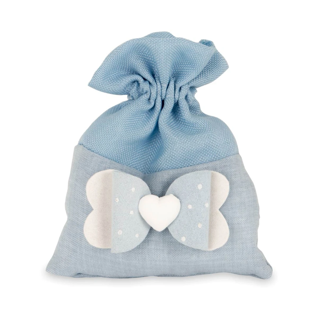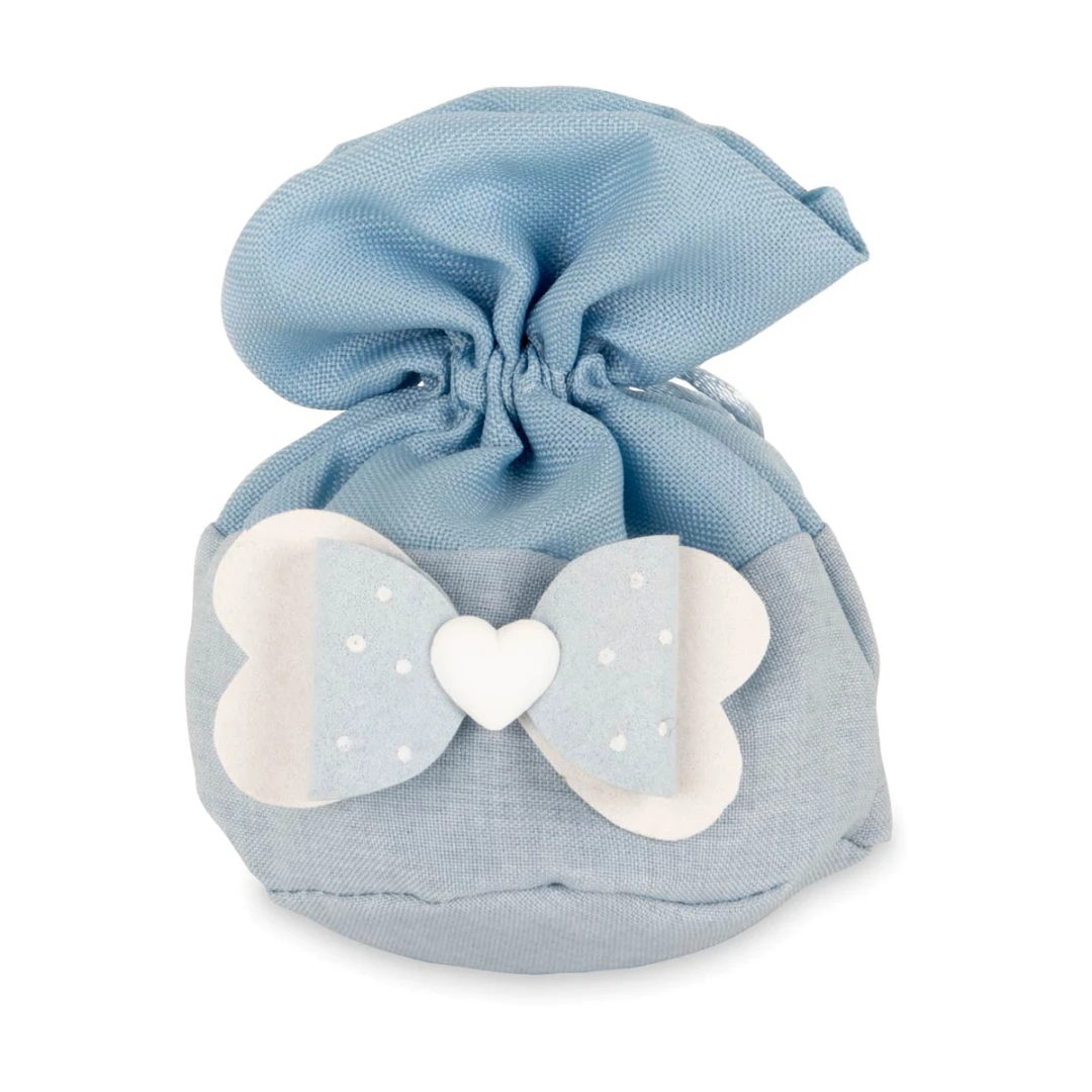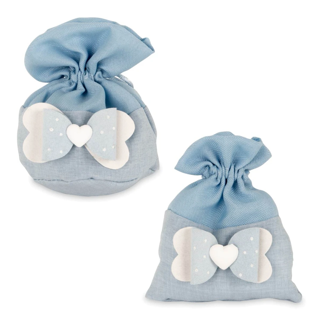 Bomboniere 2026 Battesimo e Nascita Bimbo Linea POINT Sacchettini Portaconfetti celeste con papillon, gessetto cuore e pois. Scegli il modello tra piatto e tondo, il Prezzo si riferisce a 1 sacchetto. Prodotto Artigianale.