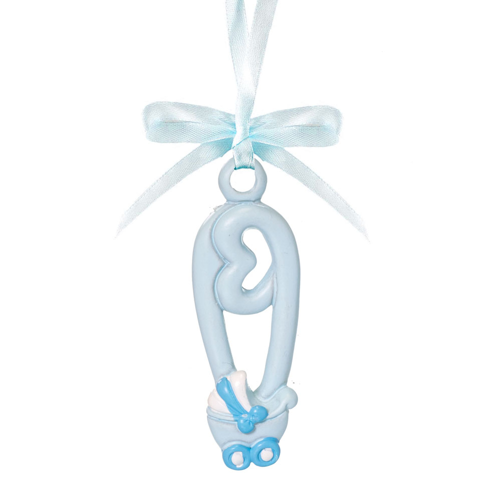 Bomboniera Battesimo e Nascita, idea per bimbo, linea di ciondoli in resina decorata a mano a forma di quadrifoglio e spilla da balia, completi di nastrino, misura 4 cm