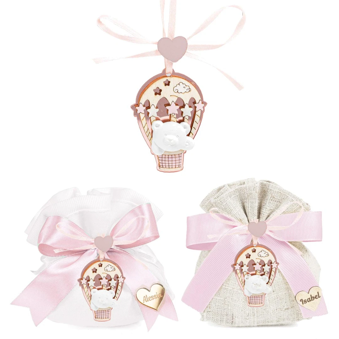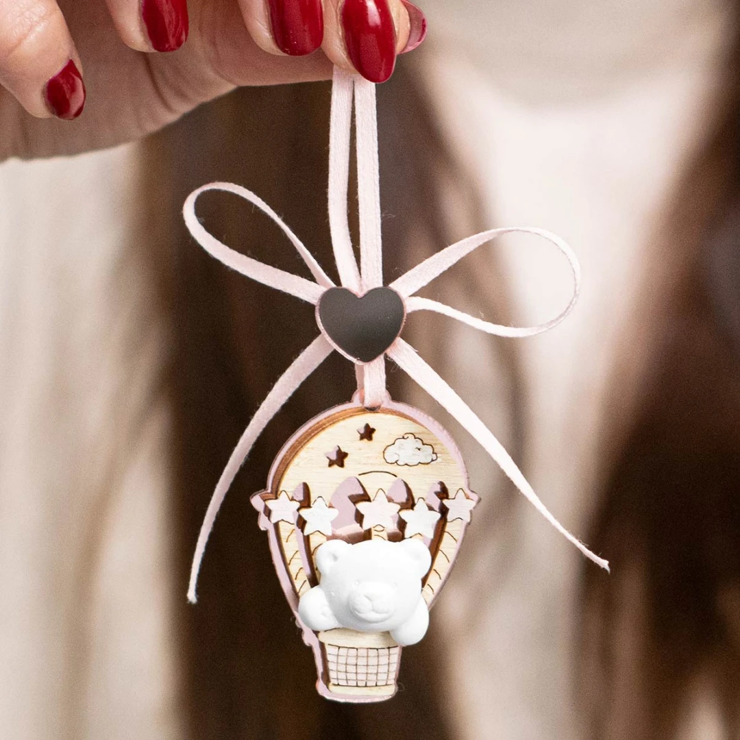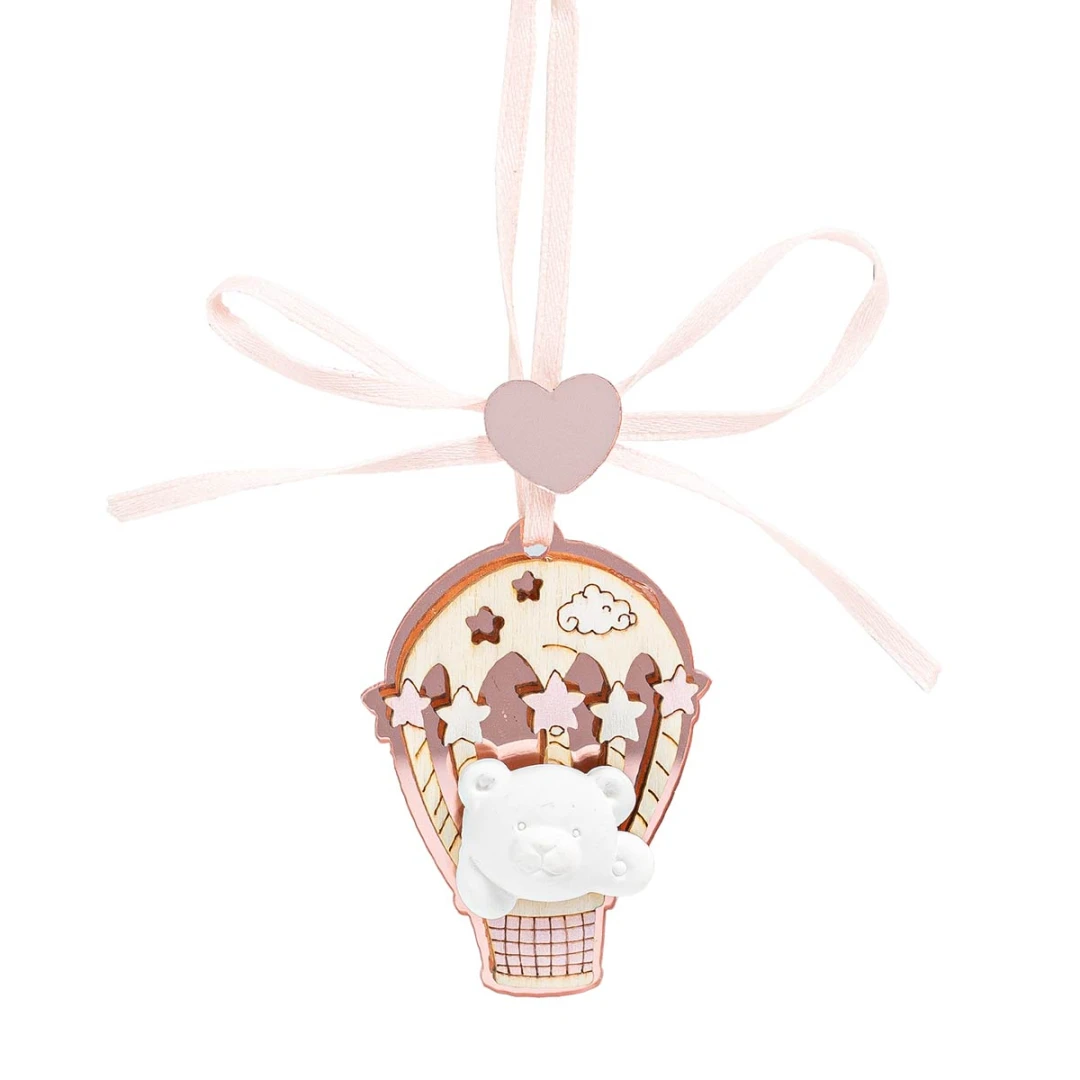 Bomboniere Battesimo e Nascita Femmina 2026, Ciondolo Mongolfiera con cuoricino su i toni del rosa il tutto decorato da orsetto e stelline in gessetto. Arriva assortito in due modelli. Prezzo cadauno. Prodotto Artigianale. Misura:3,8 x 5,2 cm | con cordino e cuore: 3.8 x 12,5 cm.