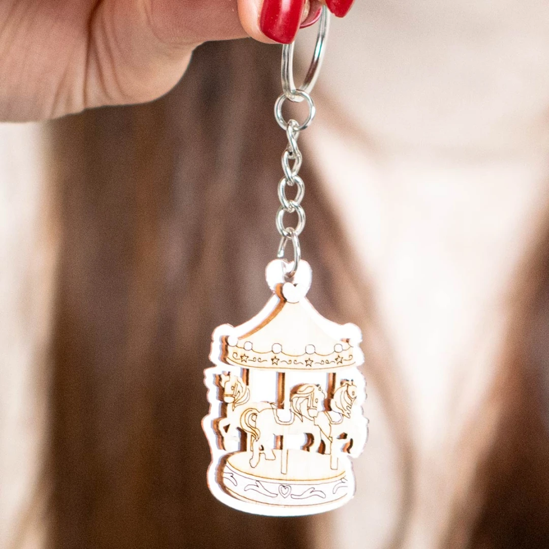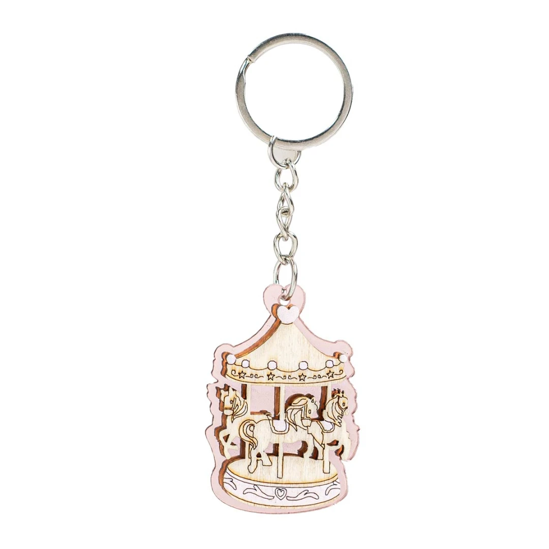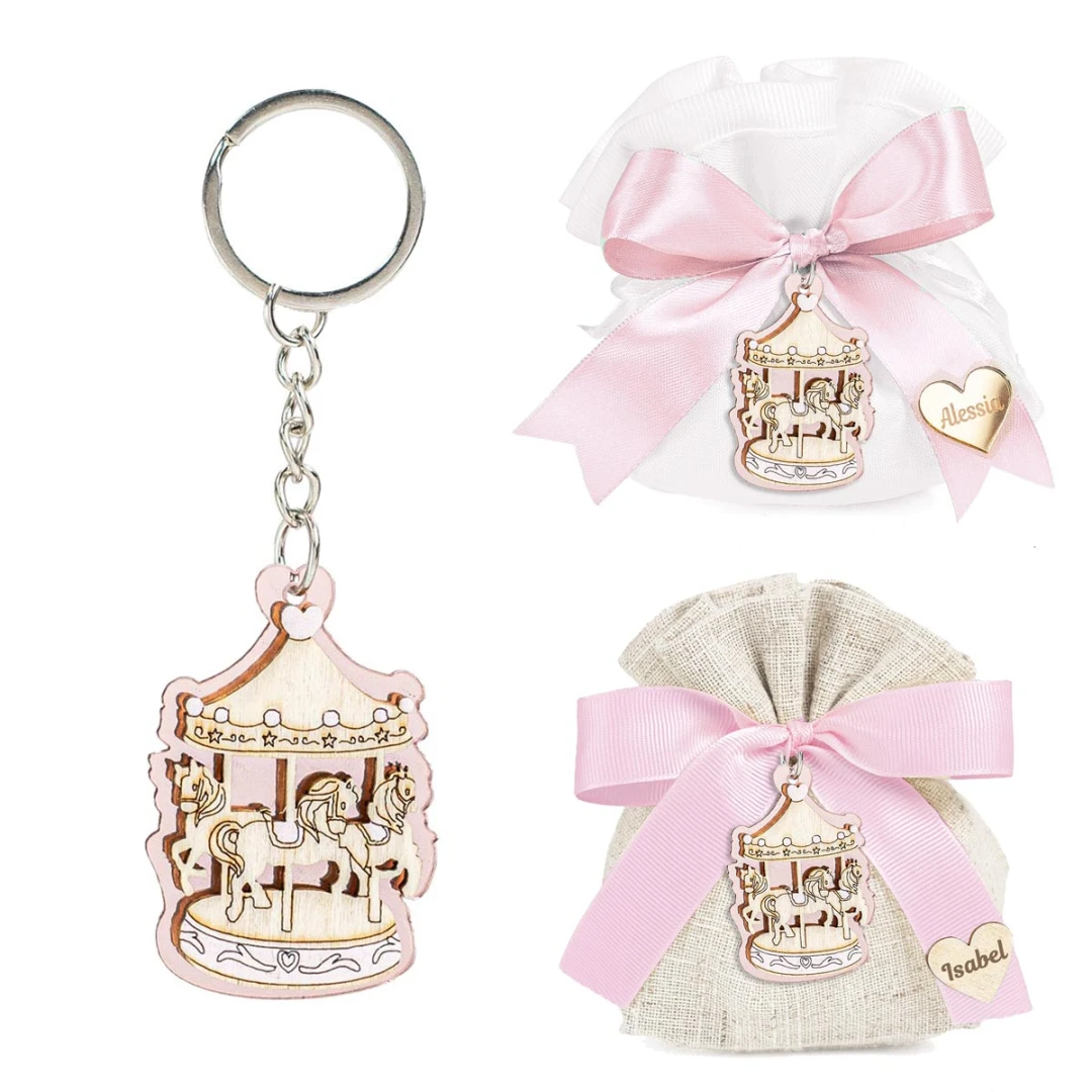 Bomboniere Battesimo e Nascita Bimba, Linea Carosello, Portachiavi sulle tonalità del rosa in legno con giostra cavallini. Prezzo cadauno. Prodotto Artigianale. Misura: 3,3 x 5 cm.
