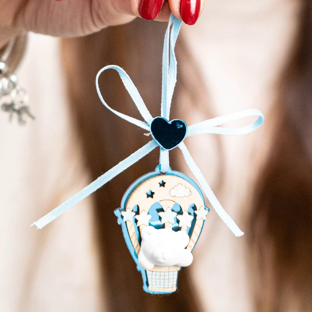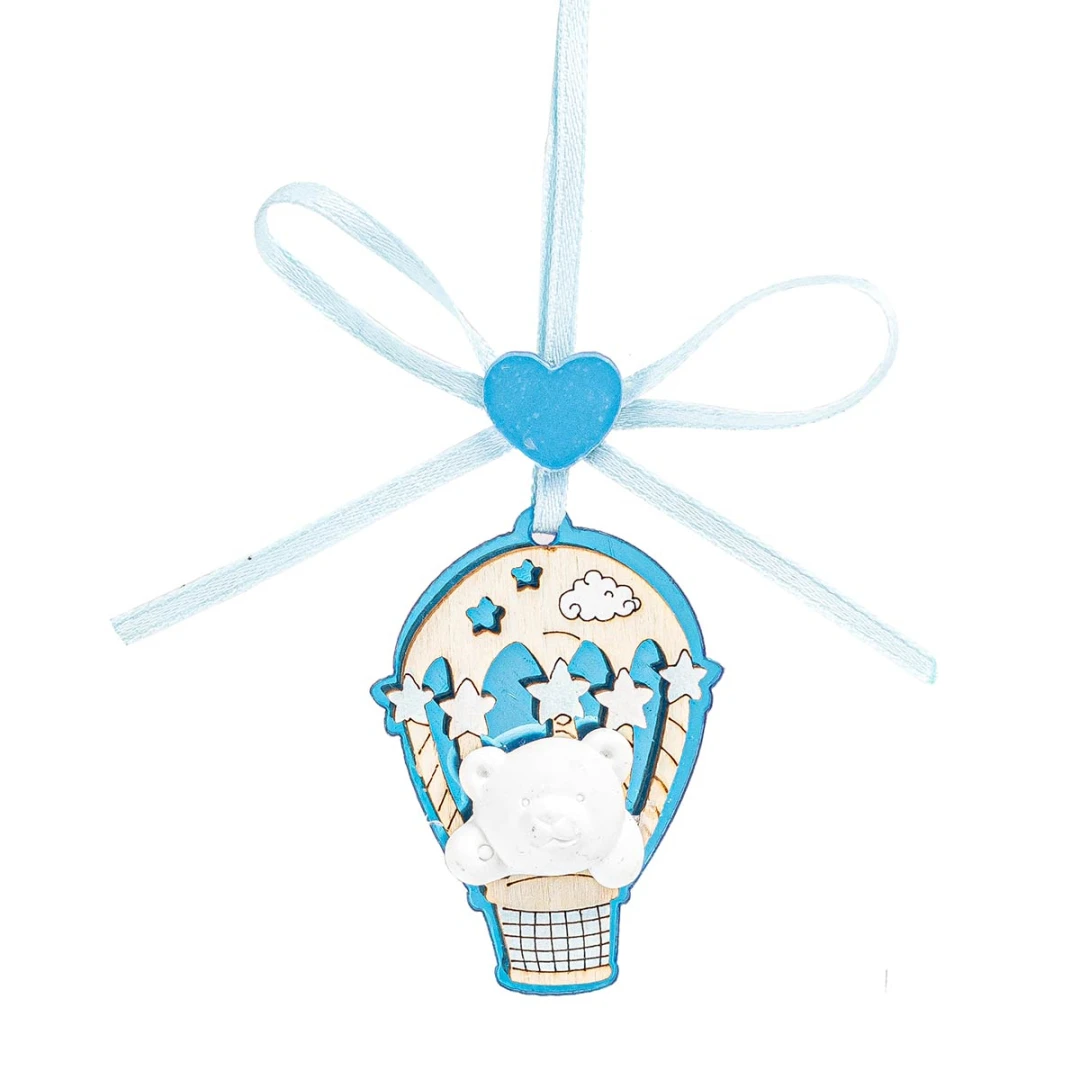 Bomboniere Battesimo e Nascita Maschio 2026, Ciondolo Mongolfiera con cuoricino su i toni del celeste il tutto decorato da orsetto e stelline in gessetto. Arriva assortito in due modelli. Prezzo cadauno. Prodotto Artigianale. Misura:3,8 x 5,2 cm | con cordino e cuore: 3.8 x 12,5 cm.