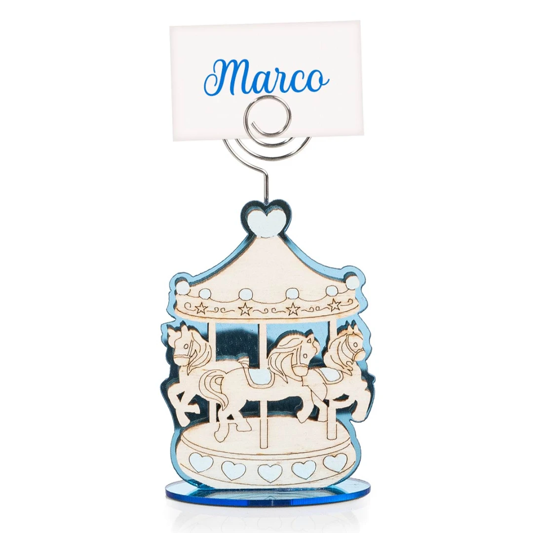 Bomboniere Battesimo e Nascita Bimbo, Linea Carosello, Clip Segnaposto sulle tonalità del celeste in legno con giostra cavallini. Prezzo cadauno. Prodotto Artigianale. Misura: 2,6 x 5 cm | h 10,5 cm. Cartoncino Omaggio.