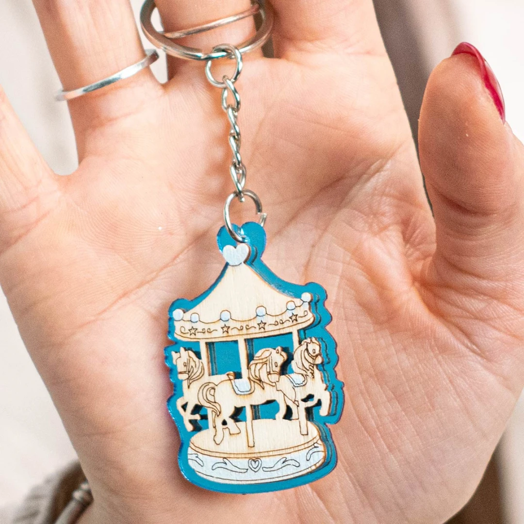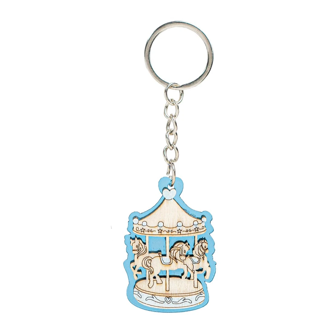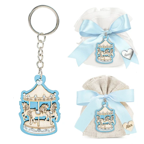 Bomboniere Battesimo e Nascita Bimbo, Linea Carosello Portachiavi sulle tonalità del celeste in legno con giostra cavallini. Prezzo cadauno. Prodotto Artigianale. Misura: 3,3 x 5 cm.