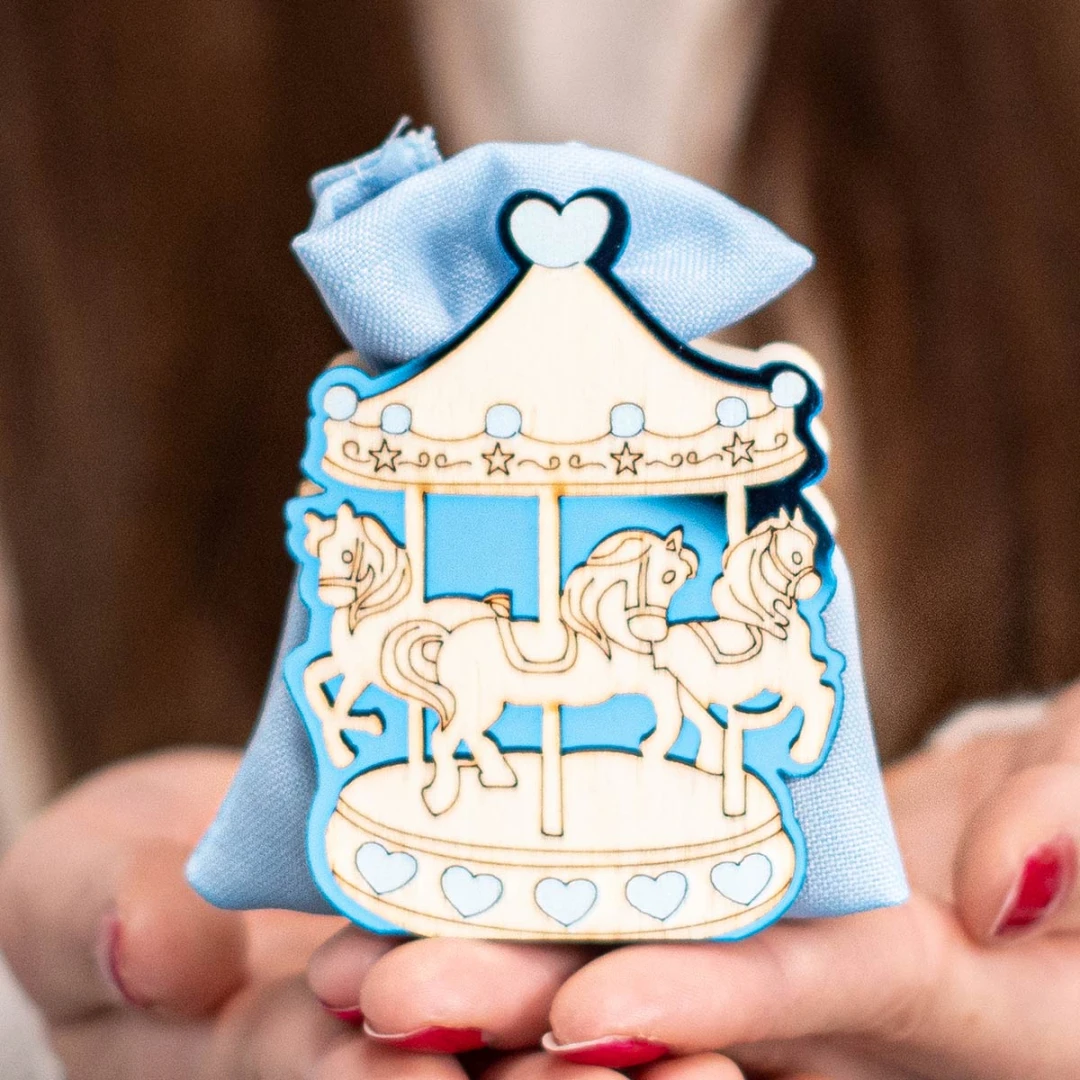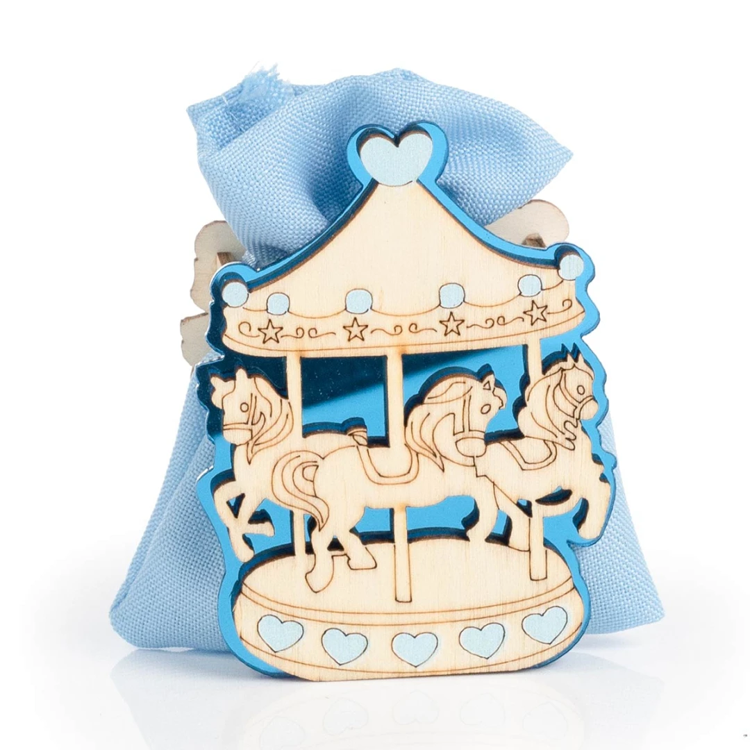 Bomboniere Battesimo e Nascita Bimbo, Linea Carosello, Scatolina con sacchettino sulle tonalità del celeste in legno con giostra cavallini. Prezzo cadauno. Prodotto Artigianale. Misura: 6 x 3, 2 cm | h 8 cm.