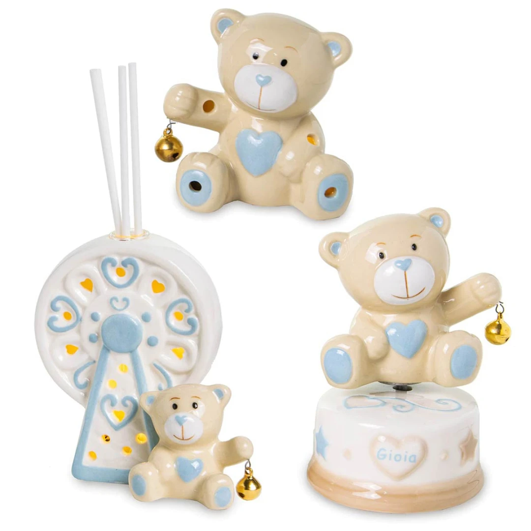 Bomboniera Cesleste Maschio, Orso Carillon, Profumatore e Orso Led. Per ogni prodotto ci sono 2 modelli assorti tra loro.