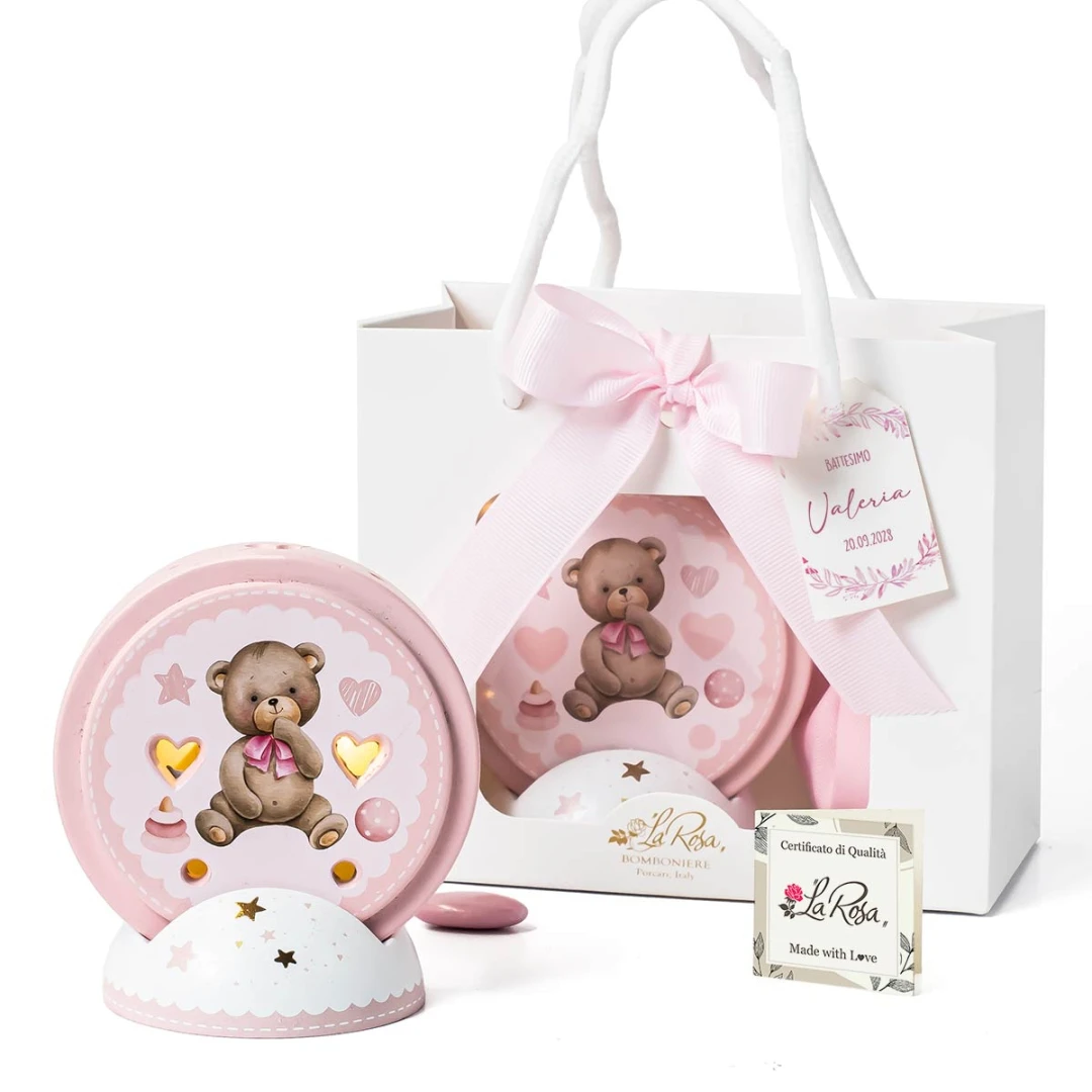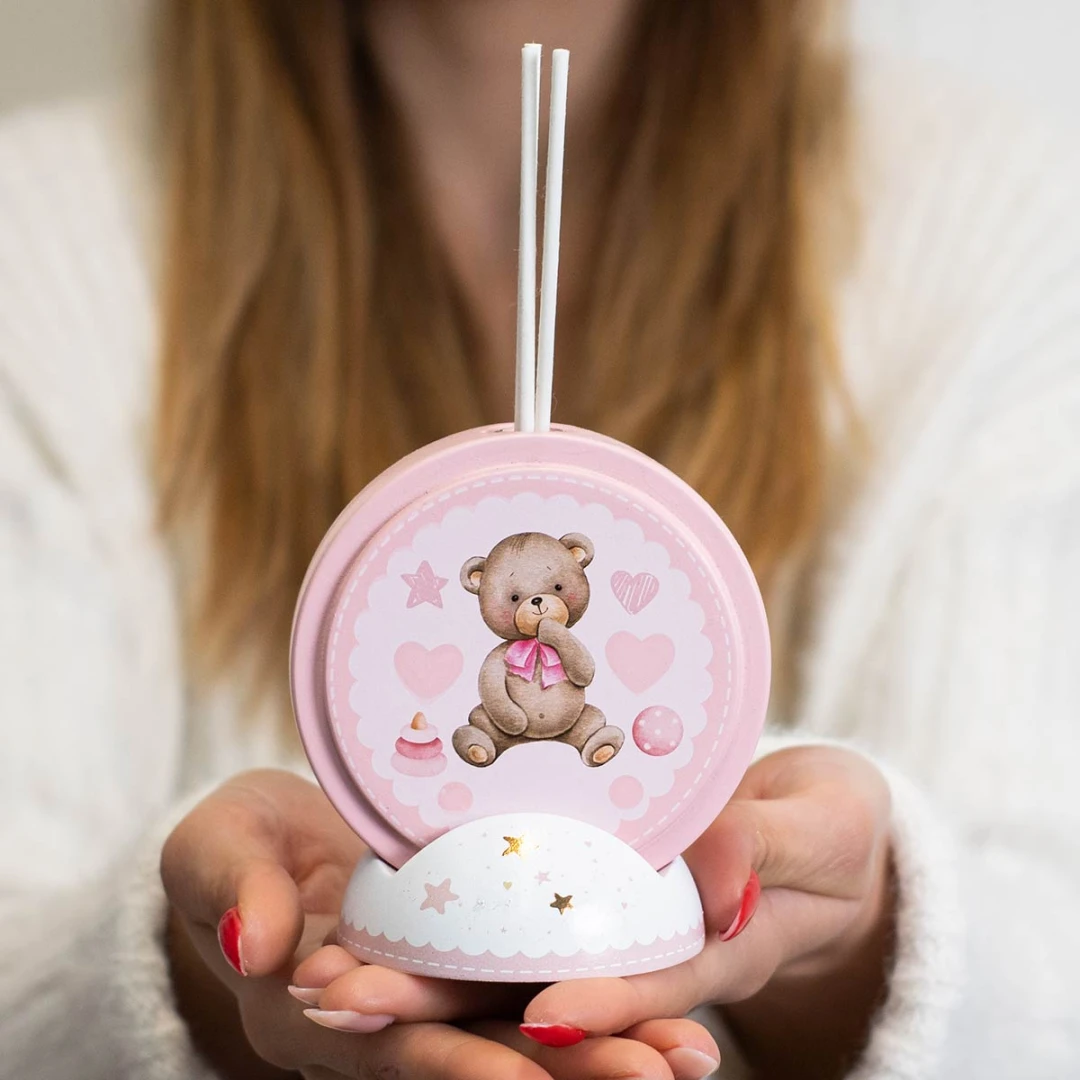 Bellissime Bomboniere 2026 Linea PITTURA Luce LED o Profumatore con orsetto rosa e base decorata in terracotta. Prezzo cadauno. Prodotto Artigianale. Pile ESCLUSE. Il profumatore arriva completo di scatola, bacchette e profumo.