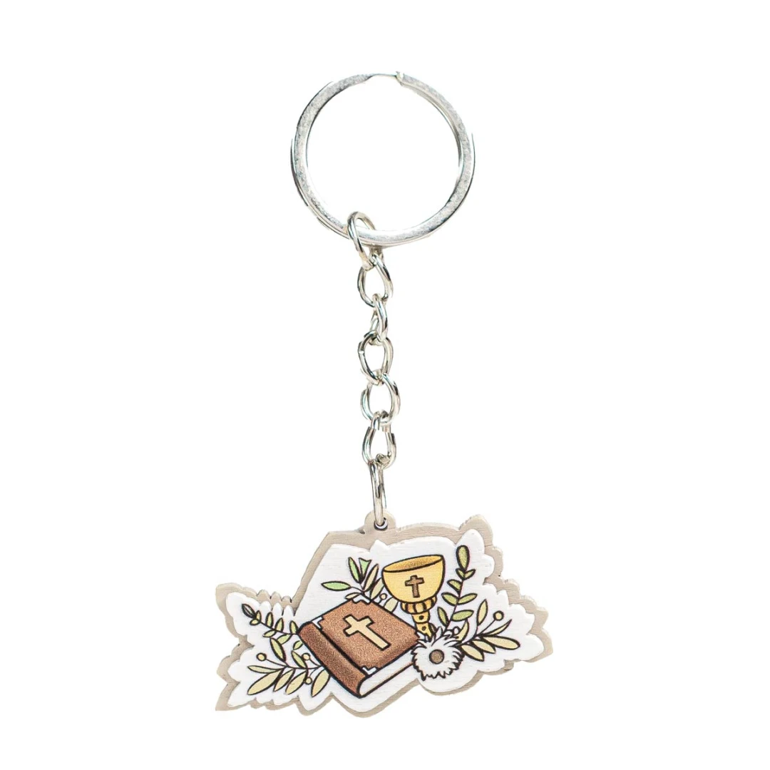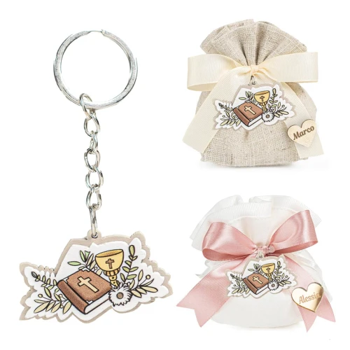 Bomboniere Comunione 2026, Linea Disegno, Portachiavi con disegno libro e calice. Prezzo cadauno. Prodotto Artigianale. Misura:3,6 x 5 cm. Inoltre, è possibile personalizzarle con un cuore in inciso con i propri nomi.
