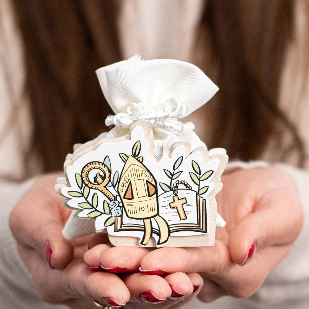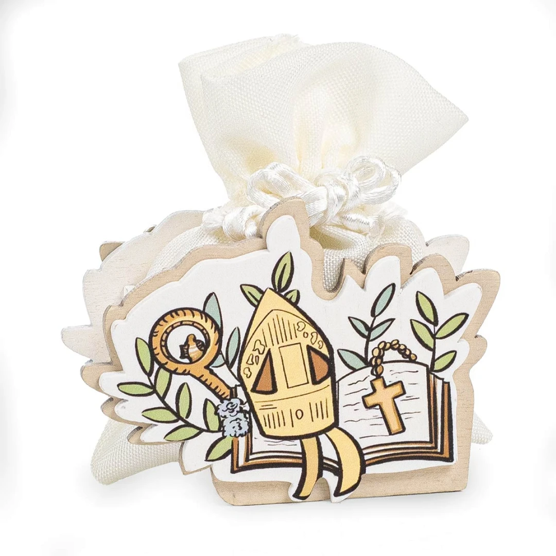 Bomboniere Cresima 2026, Linea Disegno, Scatolina portaconfetti in legno con disegno libro con cappello e bastone, inoltre all'interno presenta un sacchettino bianco. Prezzo cadauno. Prodotto Artigianale. Misura:8 x 3,6 cm | 8,5 cm circa.