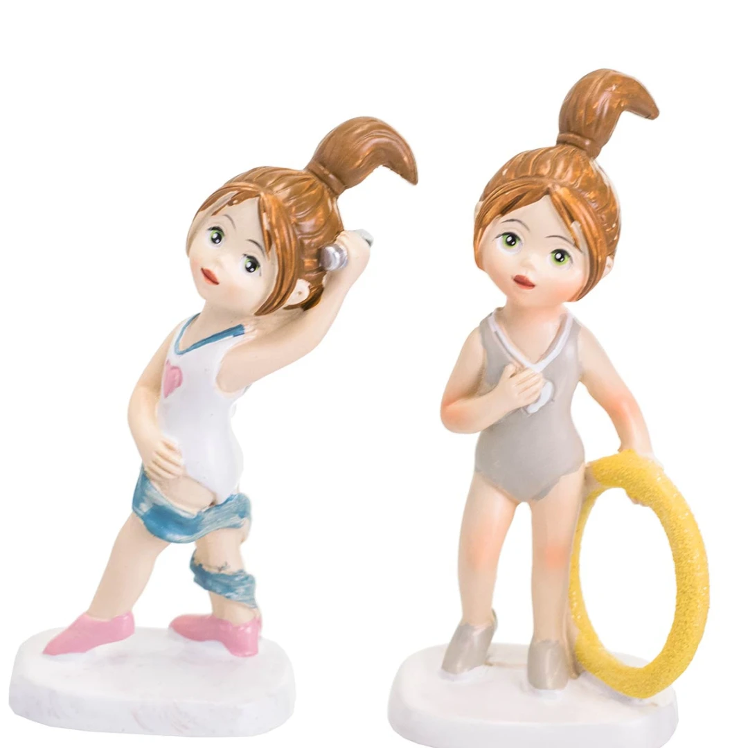 Bomboniere comunione ginnastica ritmica, ginnaste con body bianco-grigio e blu in 3 posizioni con nastro, cerchio e palla, prezzo cadauno, idea come bomboniera per bimba che pratica lo sport della ginnastica ritmica. scegli tra la misura più ginnasta standard 10 cm