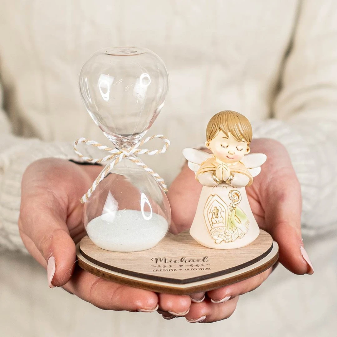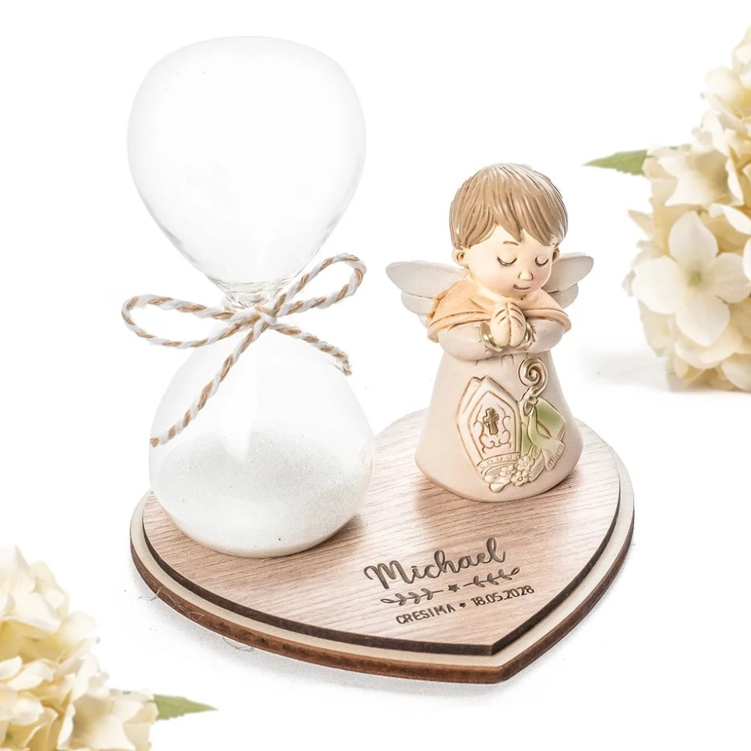 Bomboniere originali Cresima per Maschio e Femmina, collezione 2026, Clessidra e Angioletto in preghiera con simbolo cresima in resina su base a cuore personalizzato con nome, cermonia e data incisa.