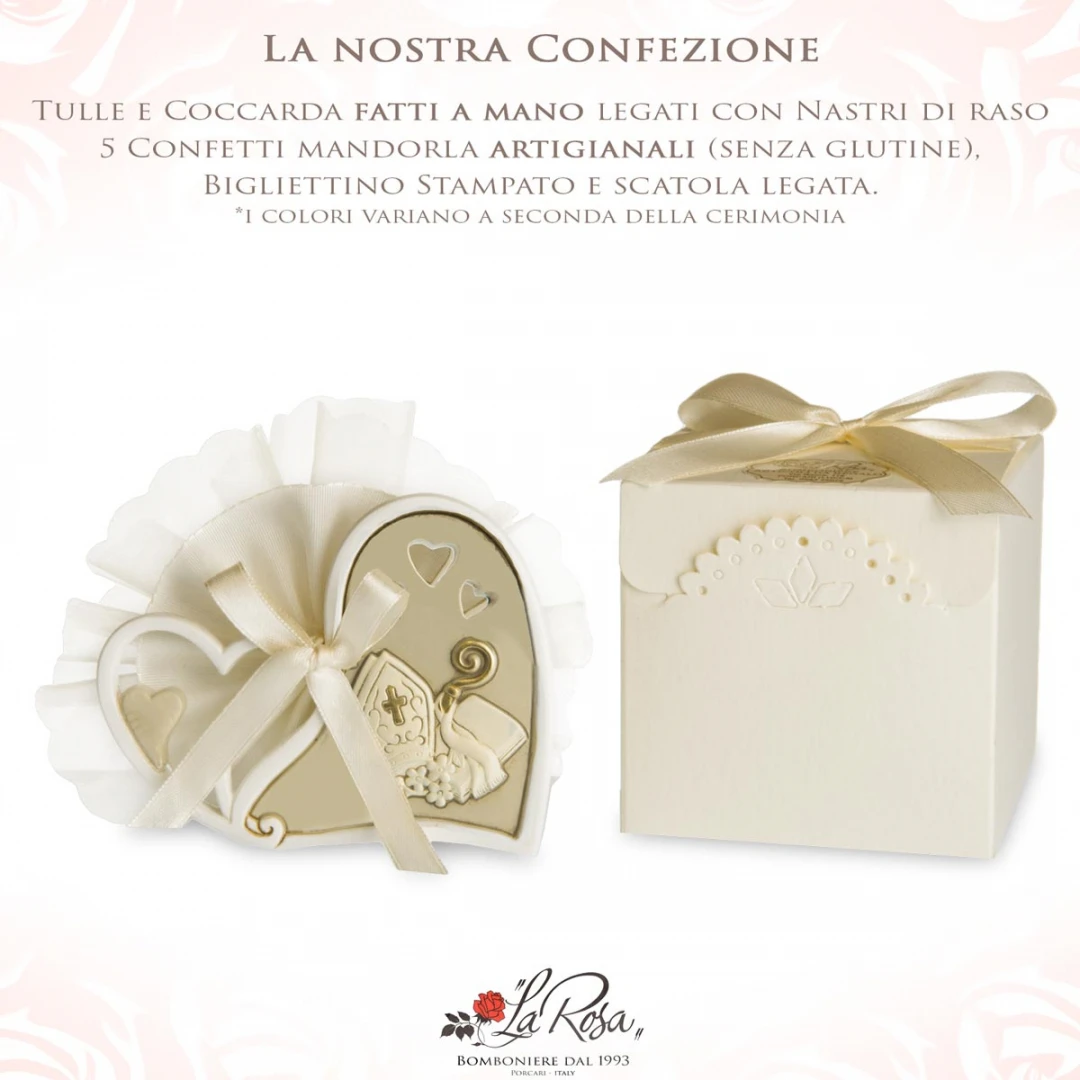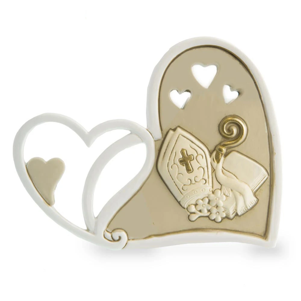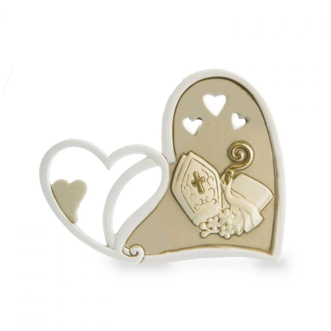Bomboniere Cresima Originali Icona a forma di Cuore, con Simbolo Cresima Bastone, Cappello, Mitria, materiale resina decorata a mano, misura piccola 8 cm e grande 11 cm.