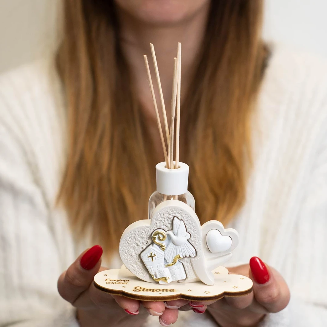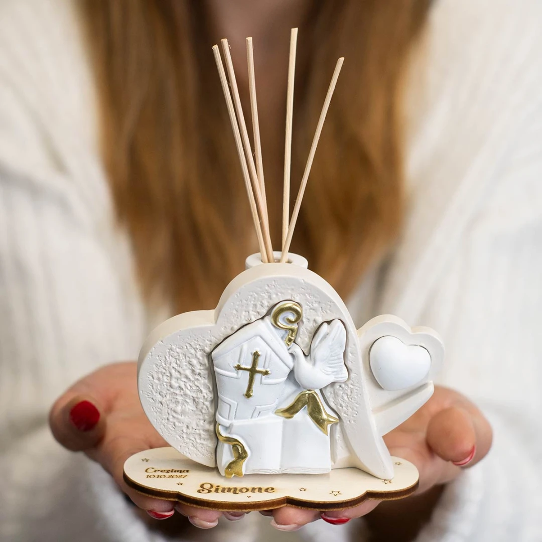 Bellissime Bomboniere 2026 Linea PETRUS Profumatore con icona sagamota a cuore decorata da cappello e bastone in resina con base in legno personalizzata e profumo sul retro. Prezzo cadauno. Prodotto Artigianale. Il profumatore arriva completo di bacchette e profumo. Disponibli due dimensioni.
