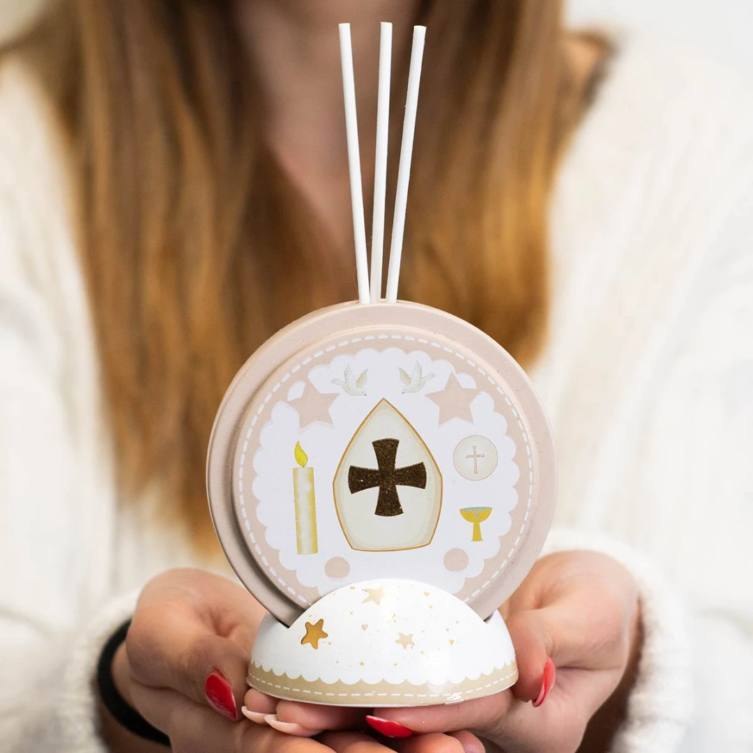 Bellissime Bomboniere 2026 Linea PITTURA Luce LED o Profumatore con cappello e bastone e base decorata in terracotta. Prezzo cadauno. Prodotto Artigianale. Pile ESCLUSE. Il profumatore arriva completo di scatola, bacchette e profumo.