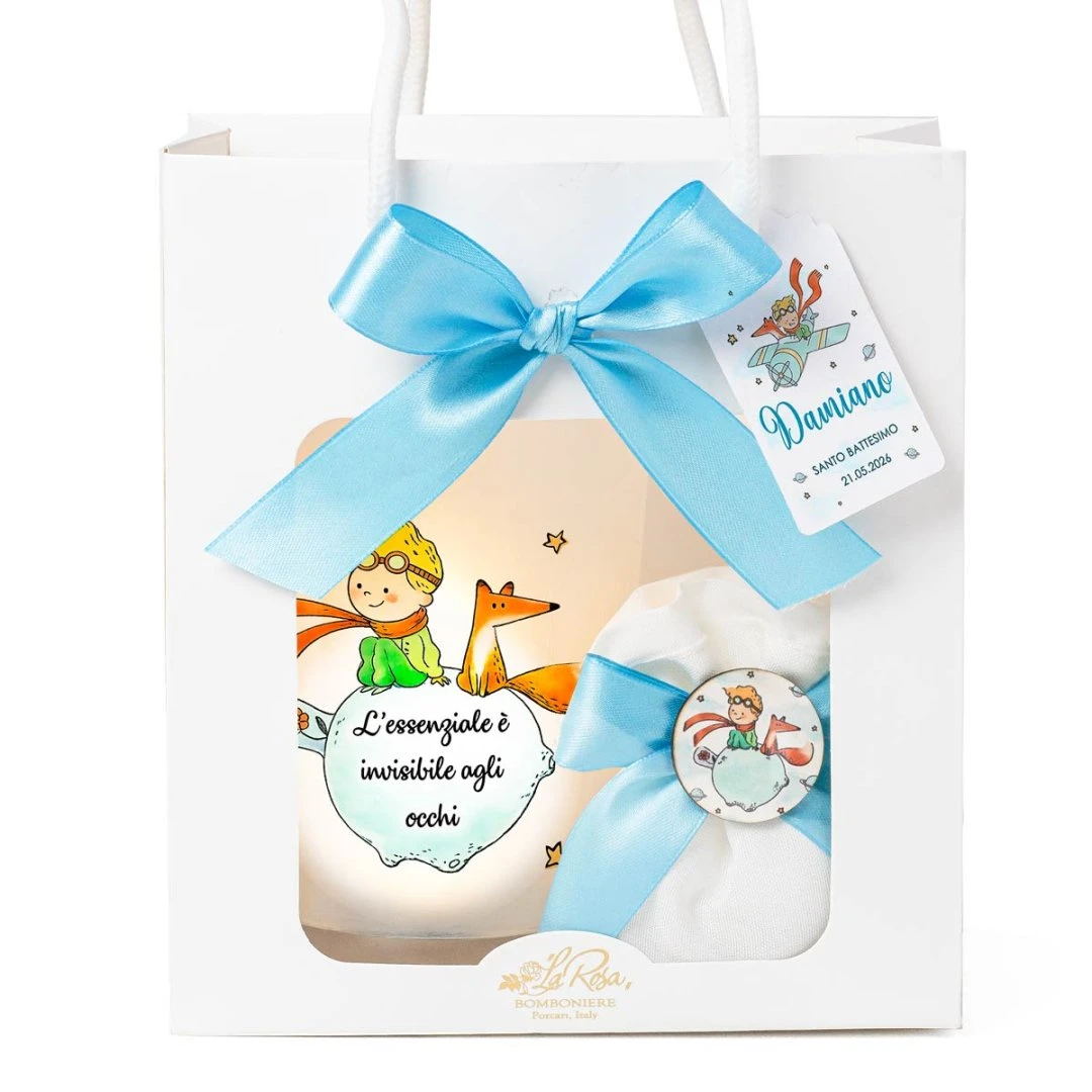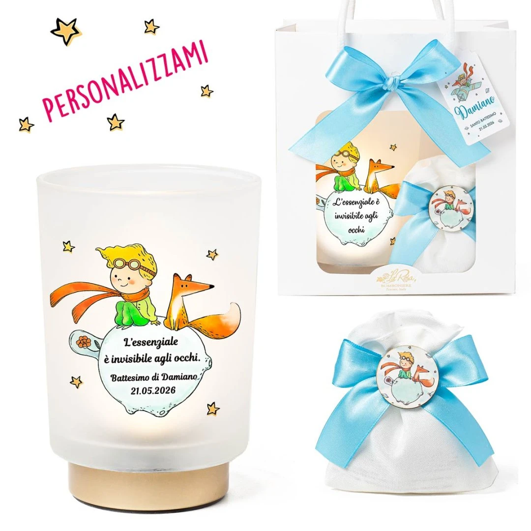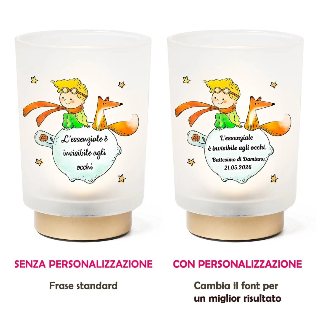 Celebra un momento indimenticabile con la nostra lampada LED Piccolo Principe, originale, delicata e ricca di significato. Questa graziosa lampada in vetro satinato è decorata con stampa a colori del Piccolo Principe e della volpe, accompagnata dalla celebre frase “L’essenziale è invisibile agli occhi”, simbolo di affetto e valori autentici.
