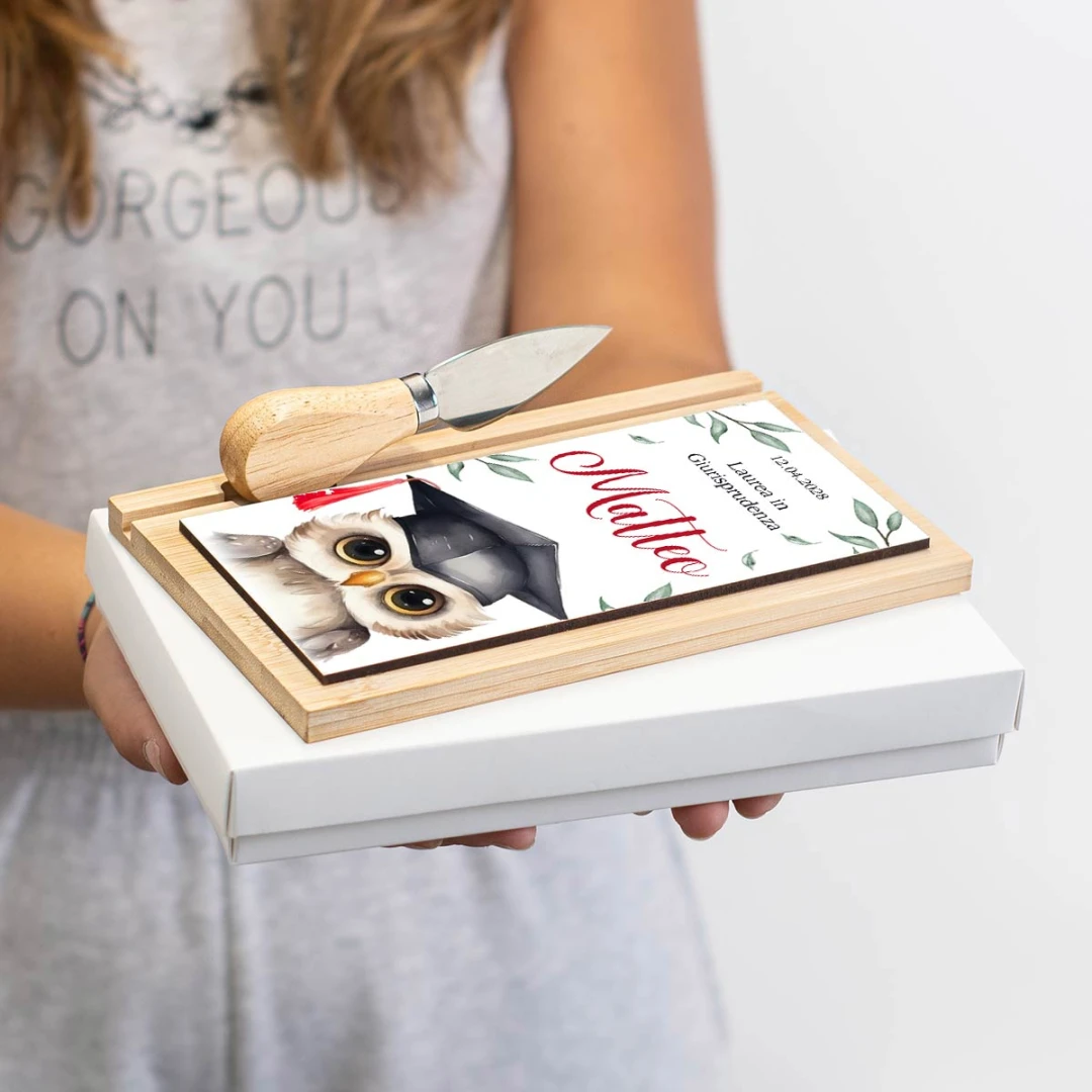 Bomboniere tagliere personalizzato con coltellino, Laurea con gufetto che indossa tocco nero, bellissima idea come bomboniera originale ed utile. Misura tagliere: 12x20x1 cm, coltellino 7 cm.