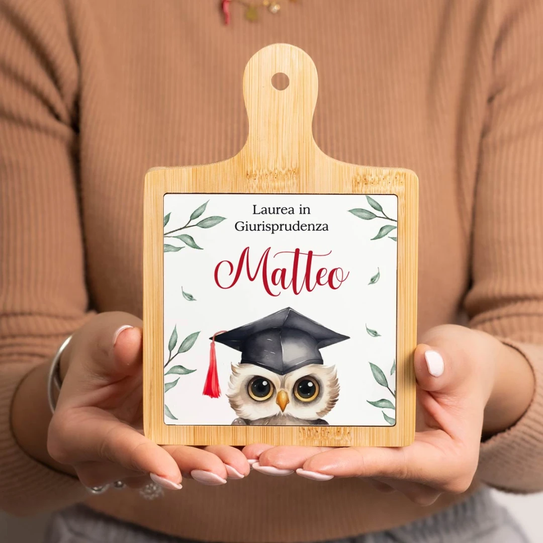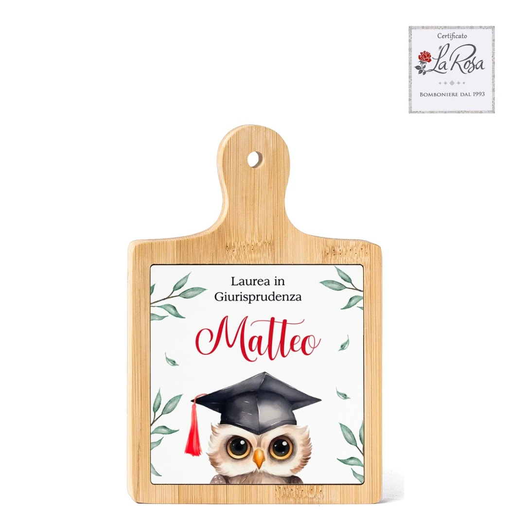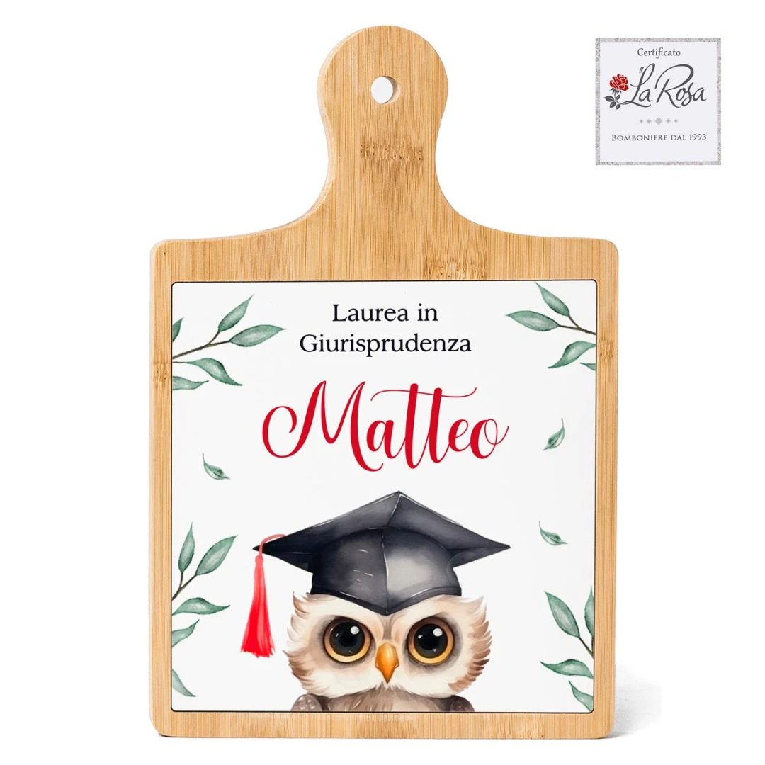 Bomboniere Laurea Gufetto Tagliere in legno con stampa personalizzata, bellissima idea come bomboniera originale ed utile.