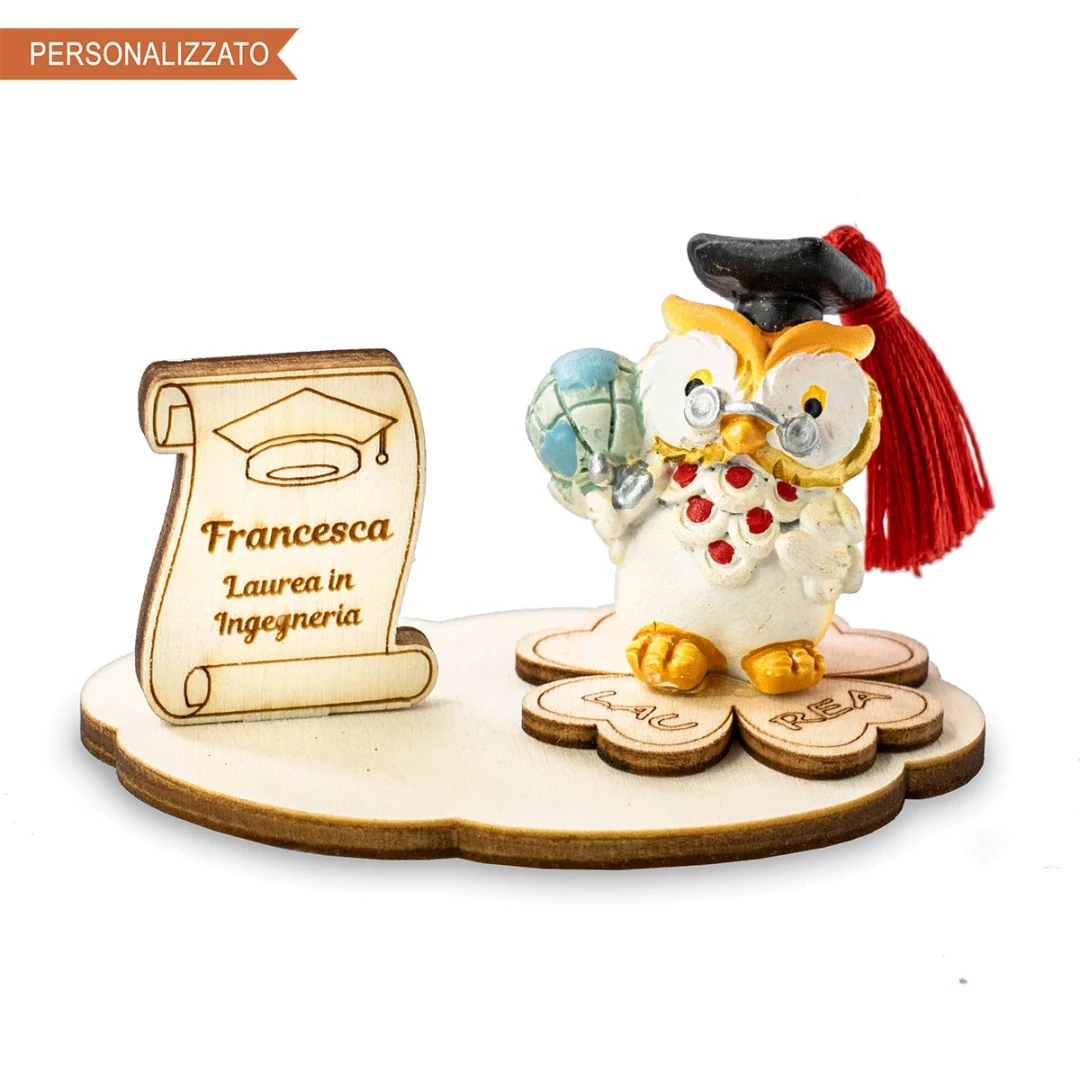 Bomboniere Laurea Personalizzzate, bellissimo articolo 2026, Gufetto su supporto in legno con pergamena incisa con scittà nome e facoltà, misura 8x5x6 cm.