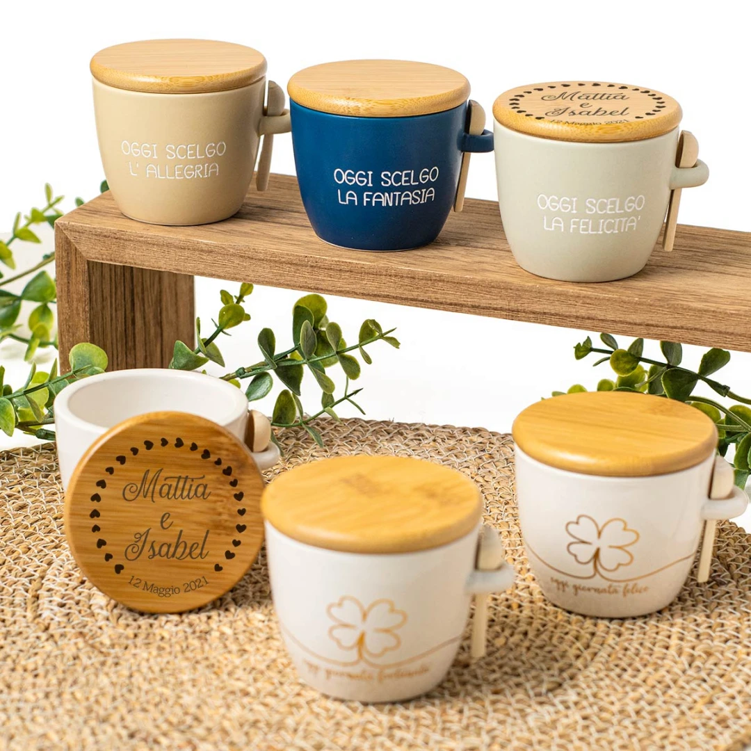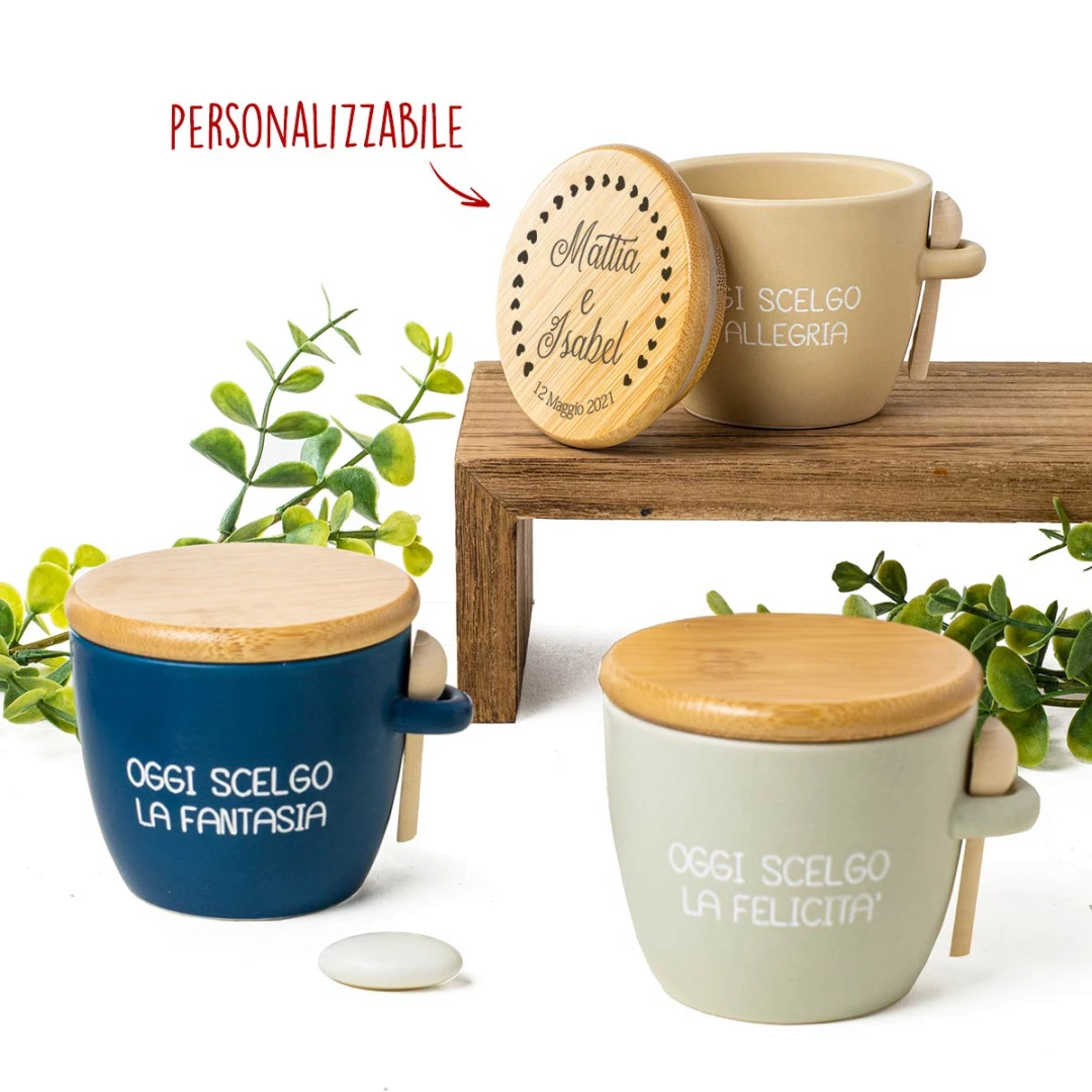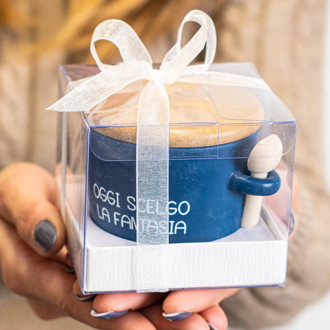 Bellissime Bomboniere 2026 Linea ALLEGRA zuccheriere in porcellana con cucchiaino. Sono disponibili sia colorate che bianche, (le colorate arrivano assortite nei colori: blu, verde e beige). Arrivano complete di scatola in pvc con nastro organza bianco. Prezzo cadauno. Prodotto Artigianale.