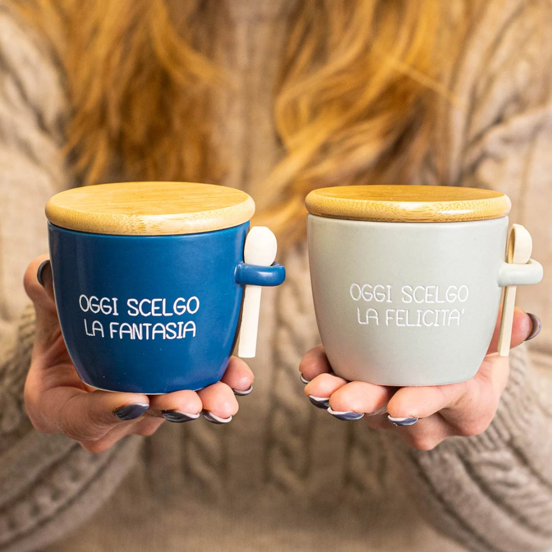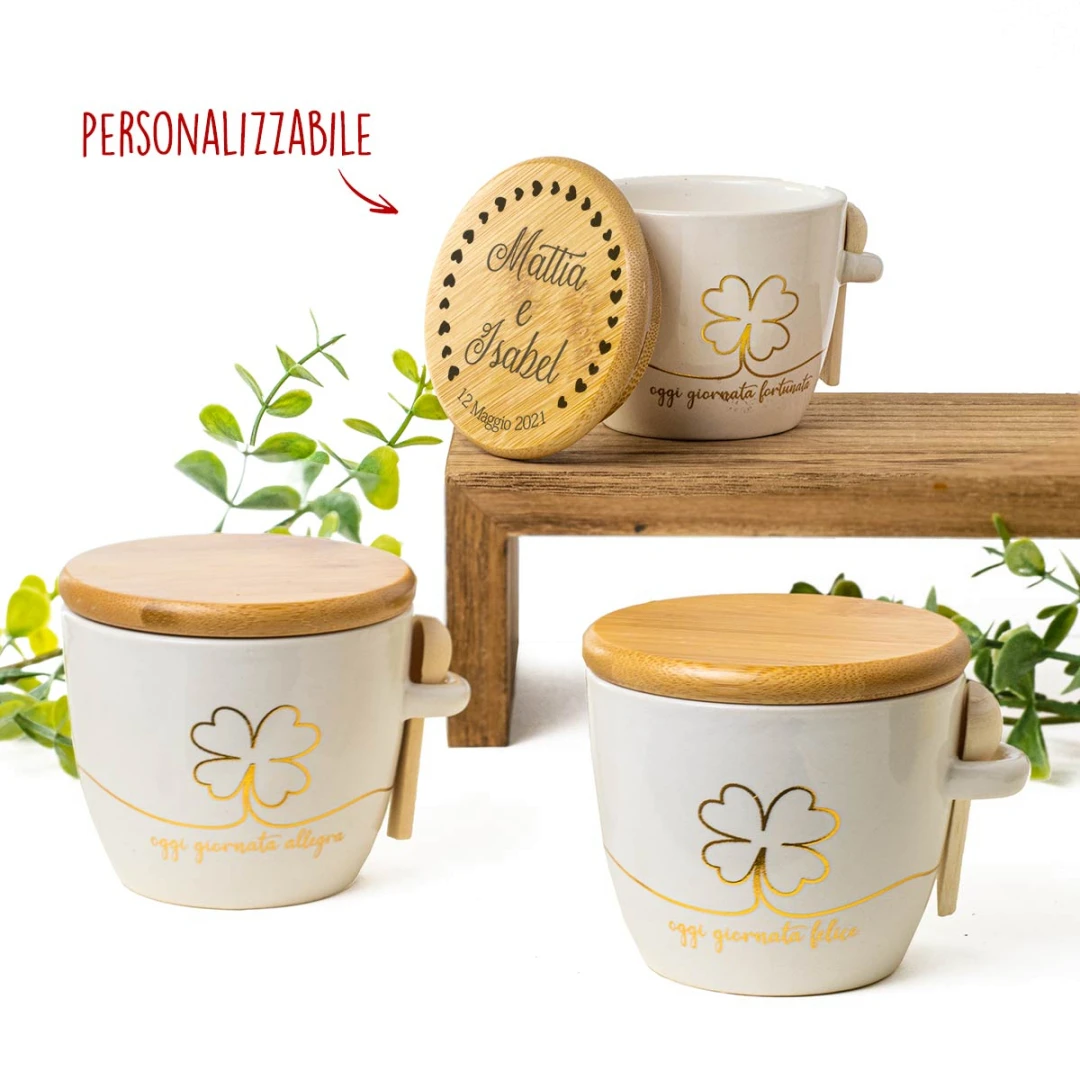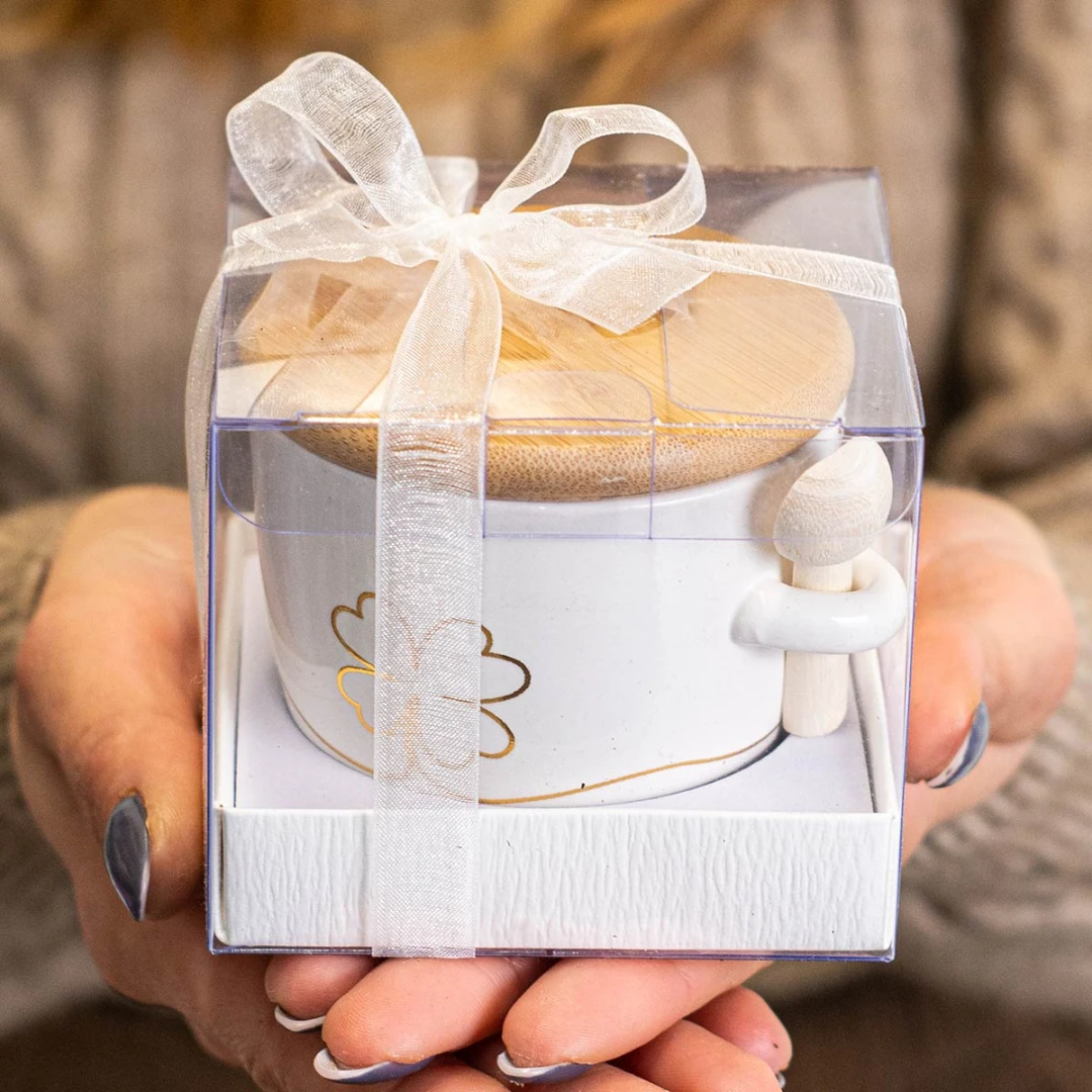 Bellissime Bomboniere 2026 Linea ALLEGRA zuccheriere in porcellana con cucchiaino. Sono disponibili sia colorate che bianche, (le colorate arrivano assortite nei colori: blu, verde e beige). Arrivano complete di scatola in pvc con nastro organza bianco. Prezzo cadauno. Prodotto Artigianale.
