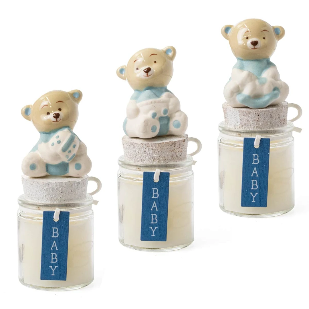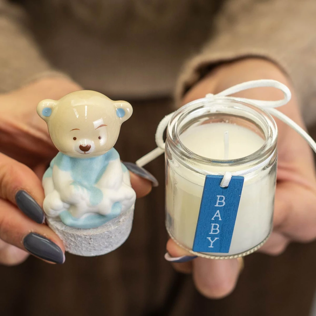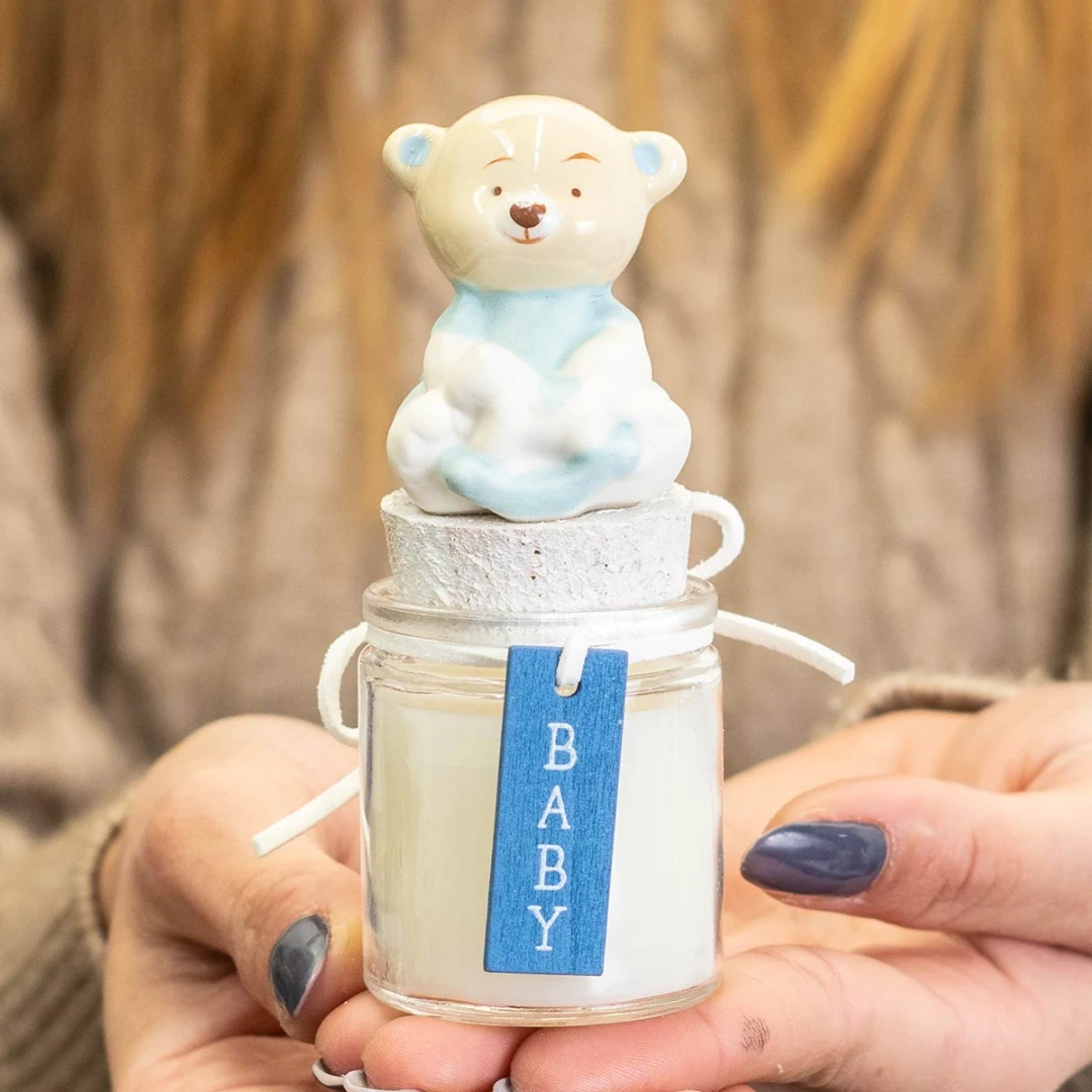 Bellissime Bomboniere Battesimo e Nascita 2026 Linea Bibì Maschio Barattolino in vetro e ceramica portacandela con orsetto e targhetta "Baby". L'orsetto arriva assortito in pose differenti. Prezzo cadauno. Prodotto Artigianale. Misura: h 11 cm.