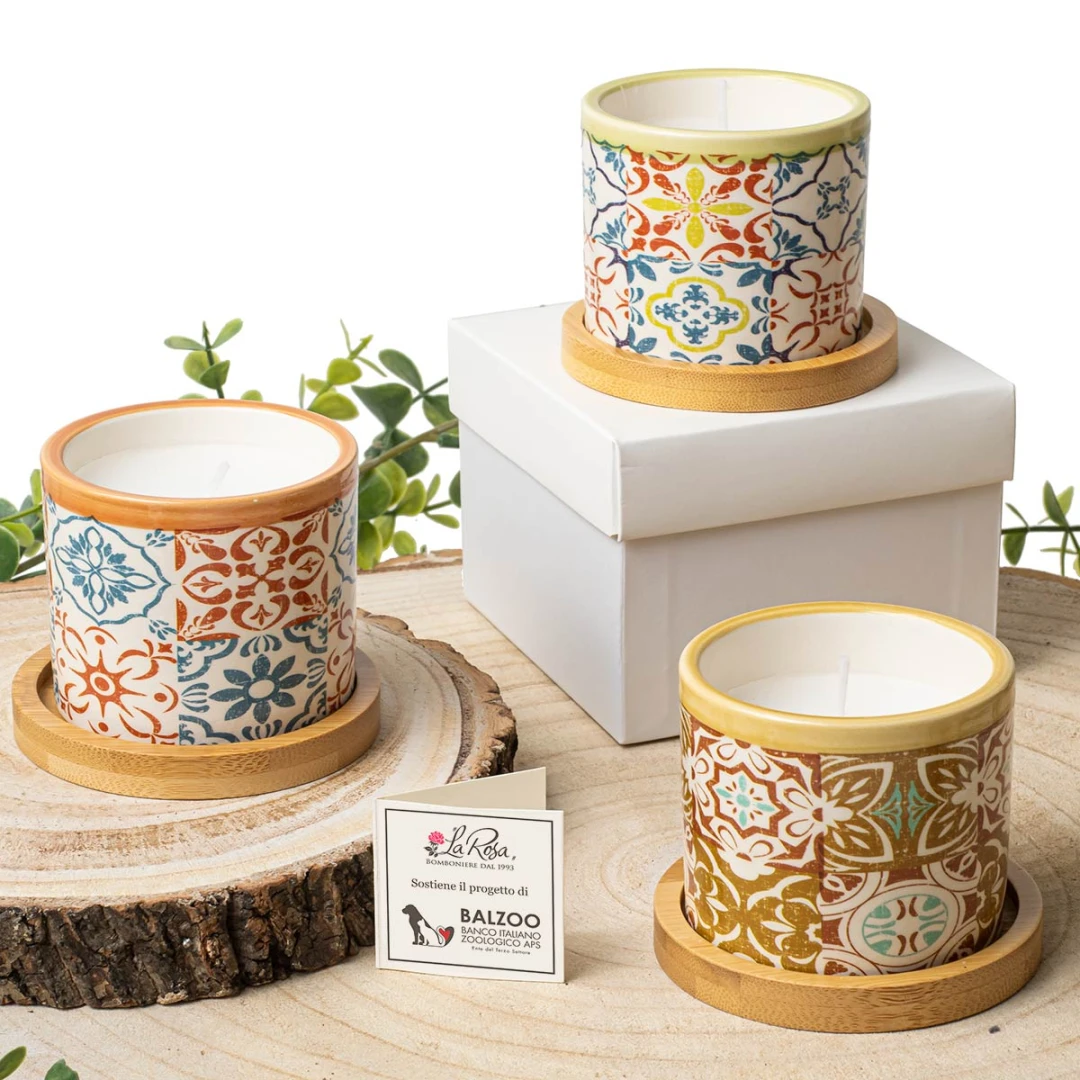 Bellissime Bomboniere 2026 Linea CORINTO, Candela in porcellana con tappo in legno completa di scatola. Misura: 8,5 x 6,5 cm. Arrivano assortiti in 3 colori (Giallo, Verde e Arancione). Prezzo cadauno. Prodotto Artigianale.
