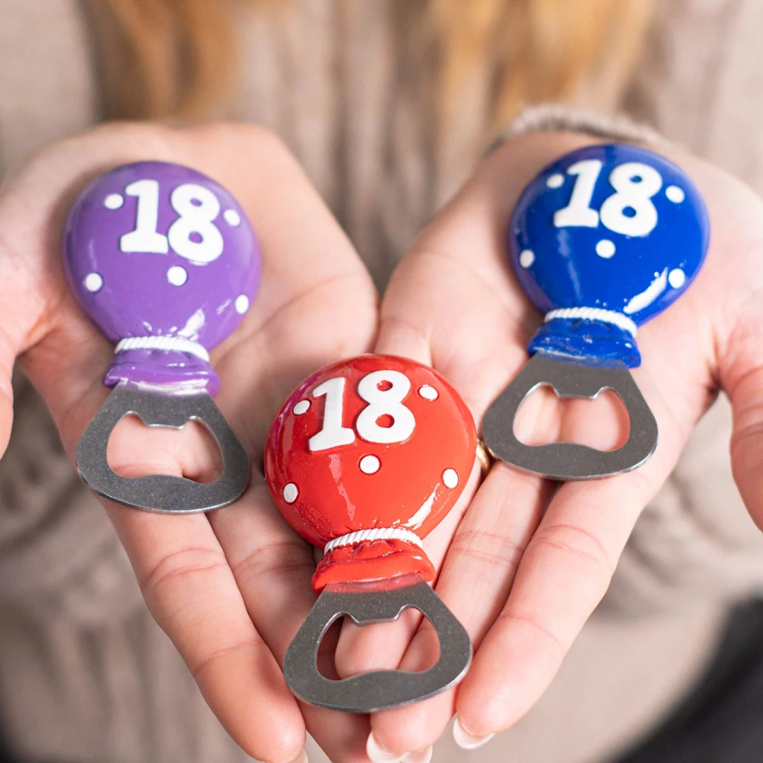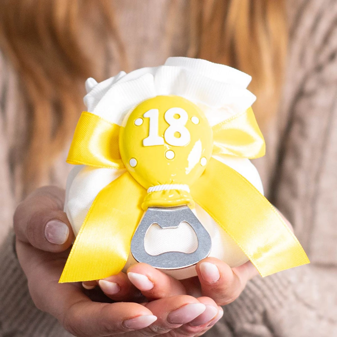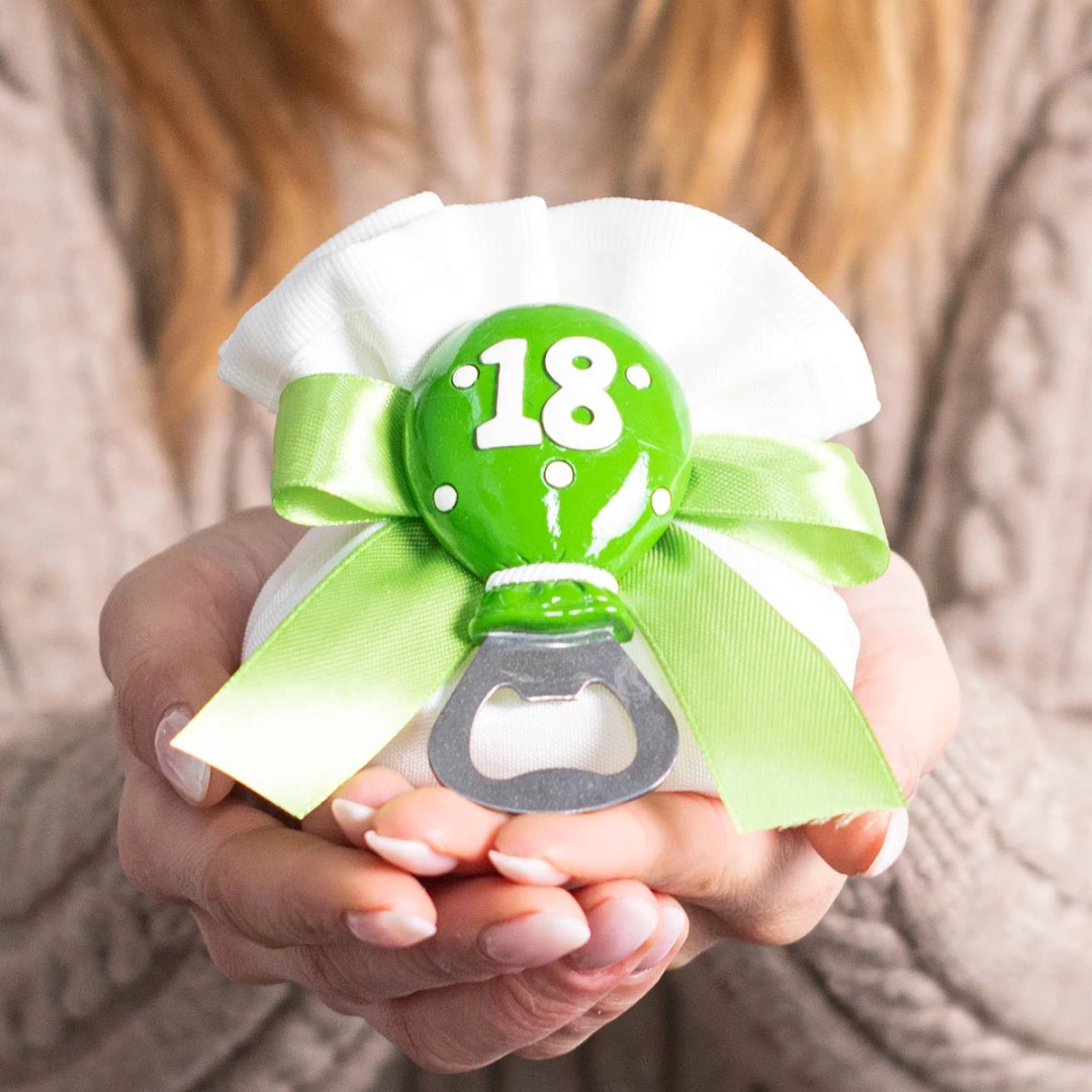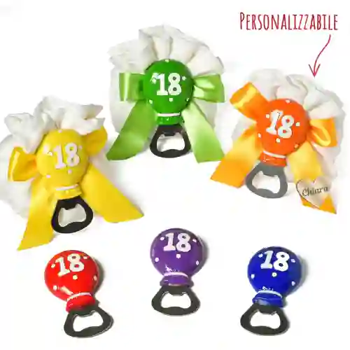 Bellissime Bomboniere 2026 Linea DICIOTTO Apribottiglie con magnete colorati con palloncino 18° Compleanno in resina. Arrivano assortite in 6 colori (Giallo, Blu, Arancione, Rosso, Verde e Viola). Prezzo cadauno. Prodotto Artigianale. Misura: 9 cm. Il nastrino sarà abbinato al magnete.
