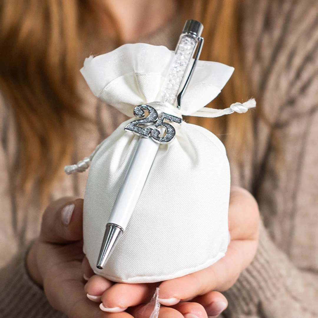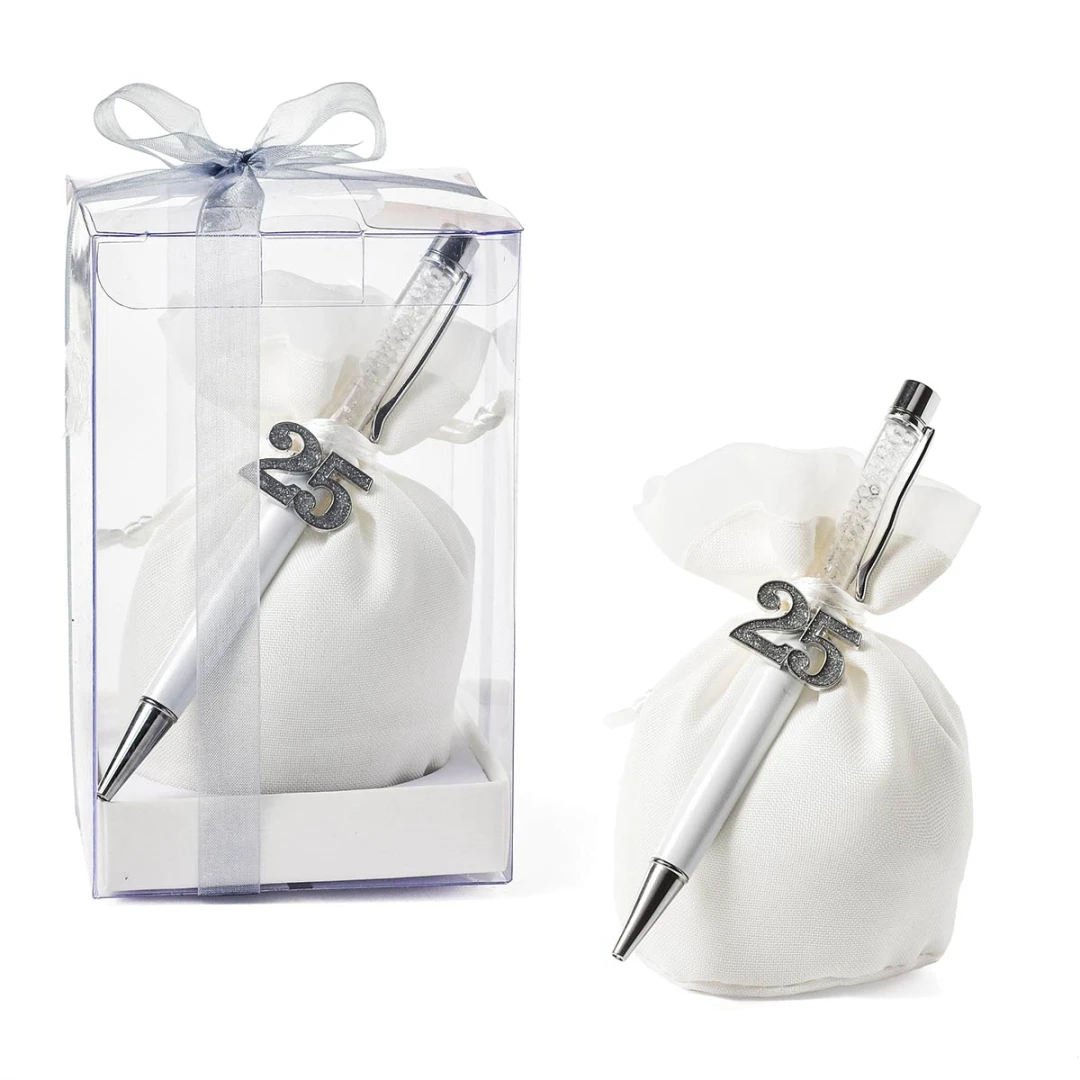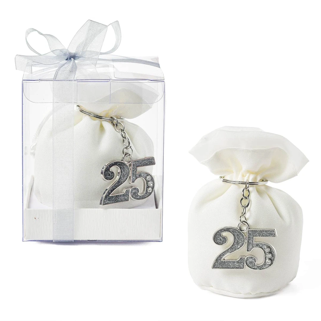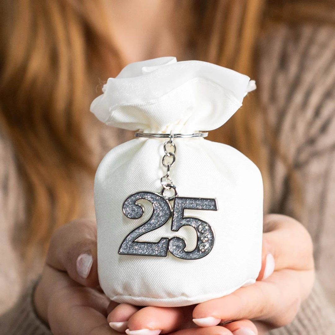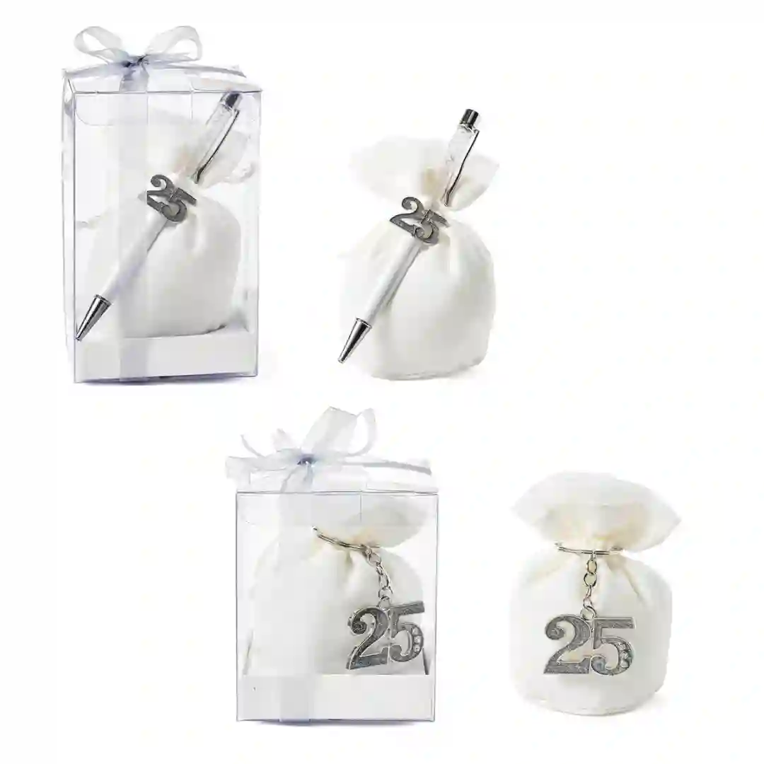 Bellissime Bomboniere 2026 Linea EVENT Set regalo Nozze d'Argento in metallo con strass. Disponibili 2 modelli. Entrambi i modelli arrivano completi di scatola in pvc, tag, sacchetto e nastro in organza bianco. Prezzo cadauno. Prodotto Artigianale.