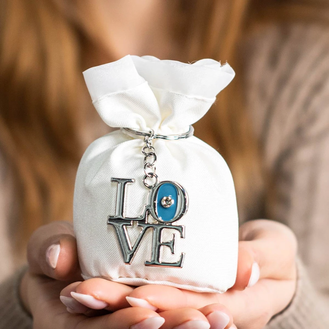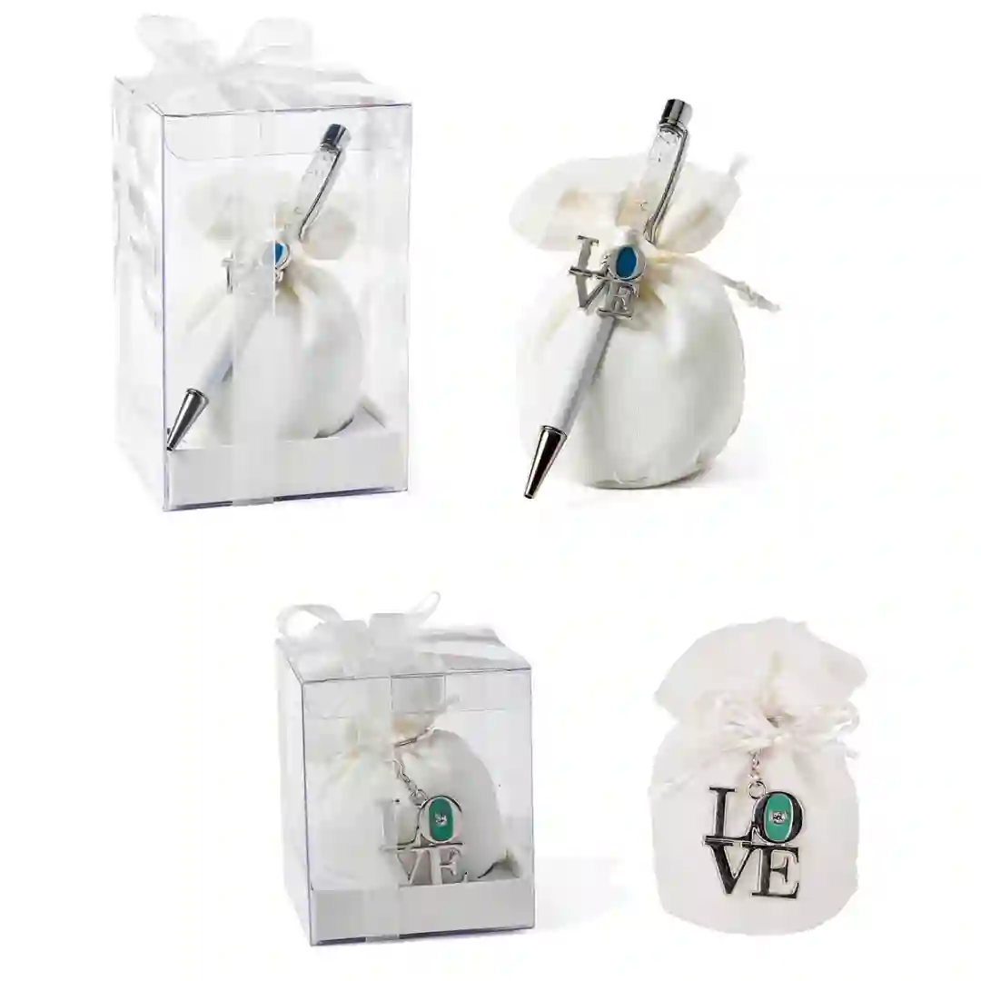 Bellissime Bomboniere 2026 Linea EVENT Set regalo LOVE in metallo. Disponibili 2 modelli. Entrambi i modelli arrivano completi di scatola in pvc, tag, sacchetto e nastro in organza bianco. Prezzo cadauno. Prodotto Artigianale.