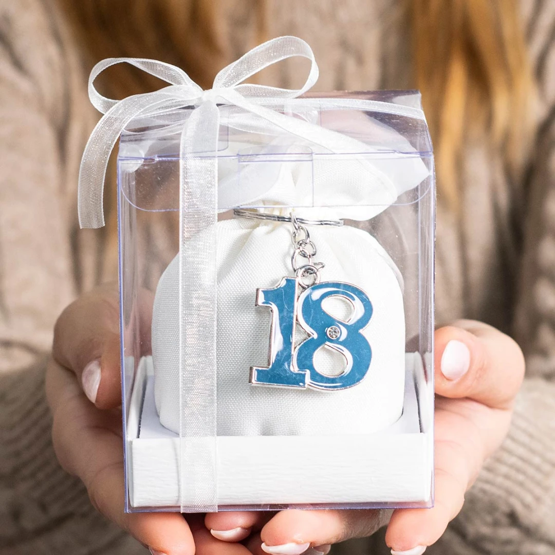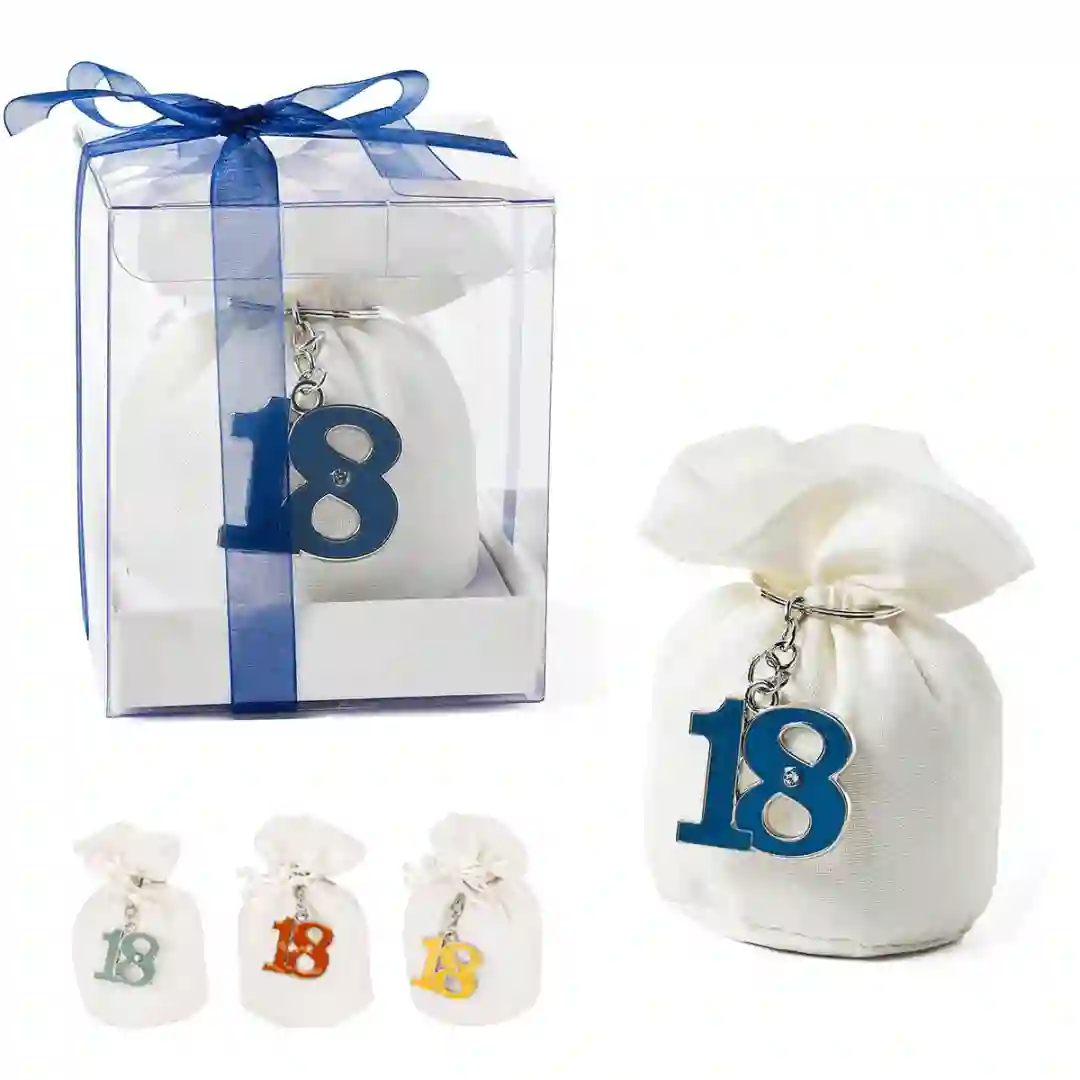 Bellissime Bomboniere 2026 Linea EVENT Set regalo Portachiavi 18 in metallo con strass. Arriva assortito in 4 colori (Verde, Giallo, Blu e Arancione) e completo di scatola in pvc, sacchetto e nastro in organza abbinato. Prezzo cadauno. Prodotto Artigianale. Misura: 3,5 cm | misura scatola in pvc: 10 x 8,5 x 8,5 cm.
