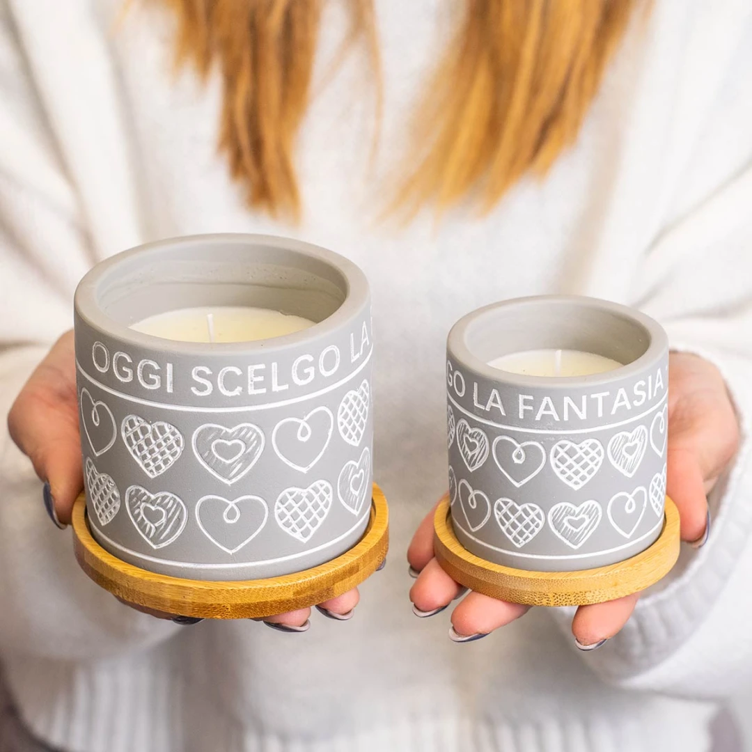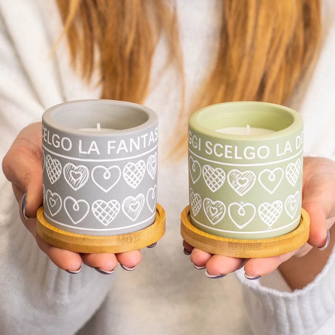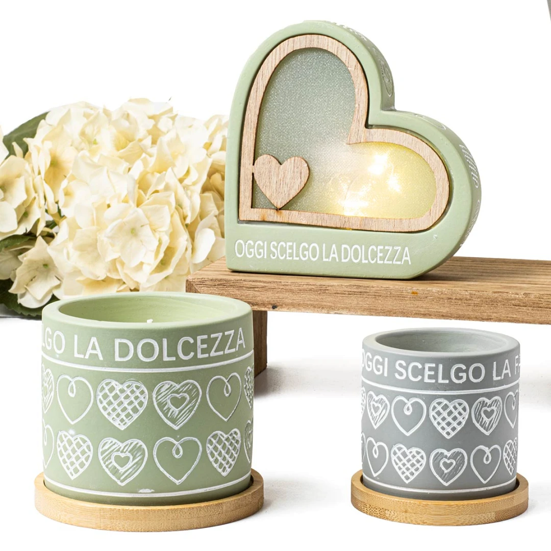 Bellissime Bomboniere 2026 Linea FANTASIA in terracotta utile con cuori astratti, Luce LED con dettagli in legno, Candela piccola e Candela grande con tappo in legno. Arrivano assortiti in 2 colori (Verde e Grigio). Prezzo cadauno. Prodotto Artigianale.