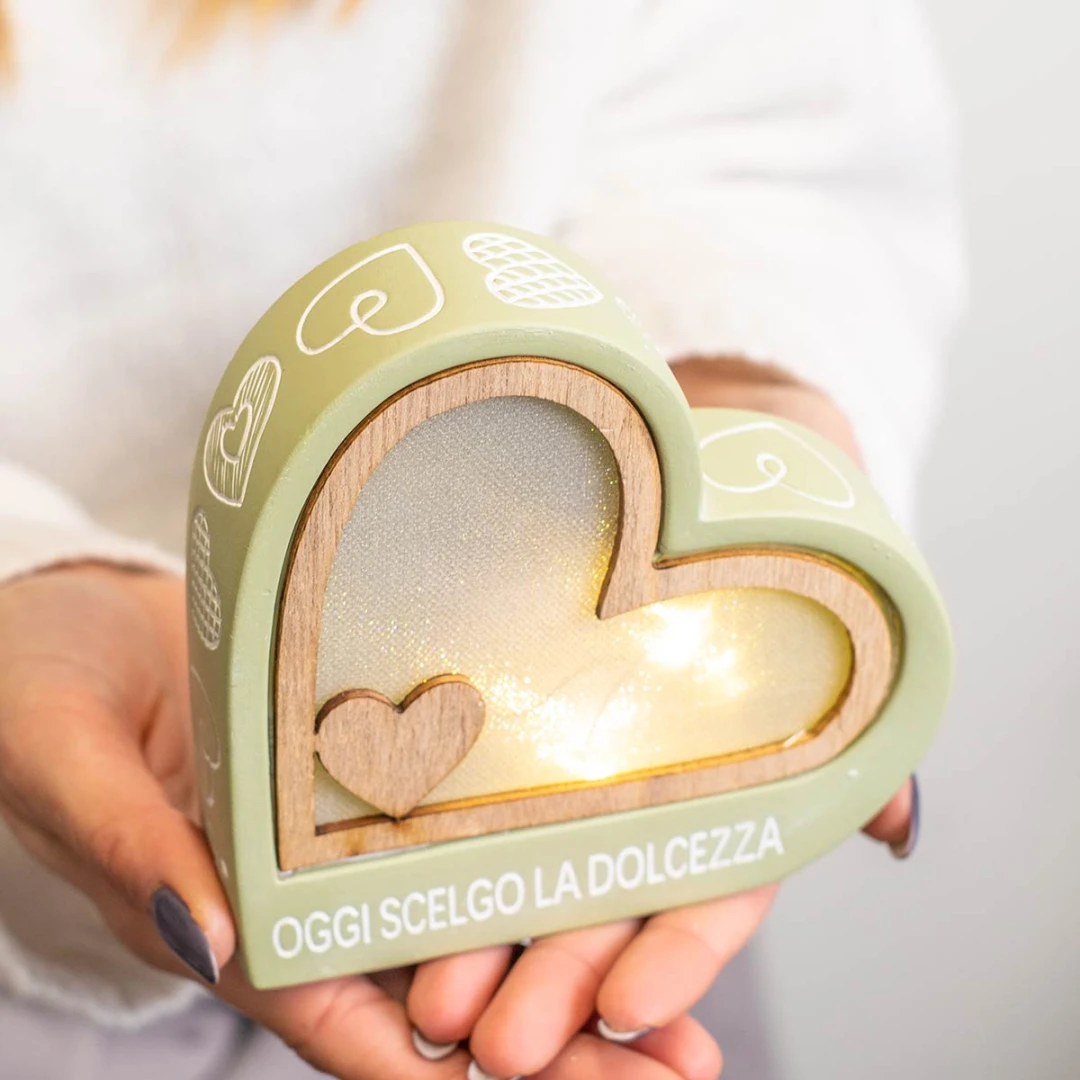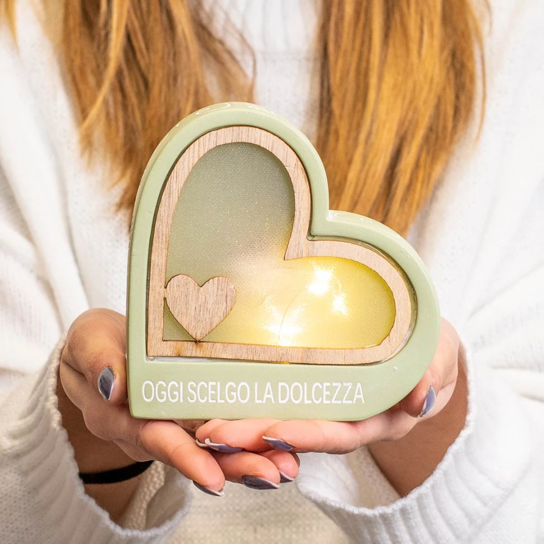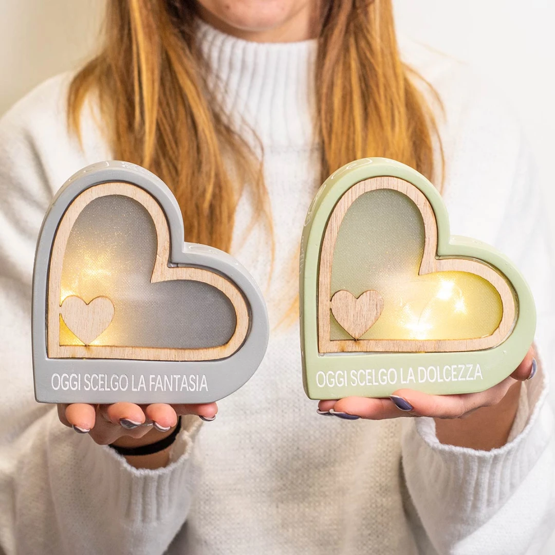 Bellissime Bomboniere 2026 Linea FANTASIA in terracotta utile con cuori astratti, Luce LED con dettagli in legno, Candela piccola e Candela grande con tappo in legno. Arrivano assortiti in 2 colori (Verde e Grigio). Prezzo cadauno. Prodotto Artigianale.