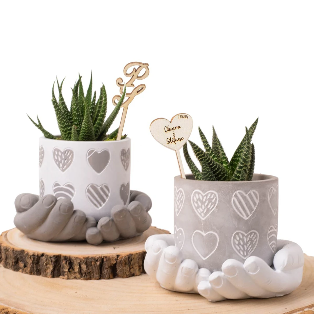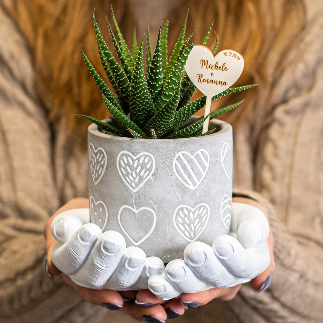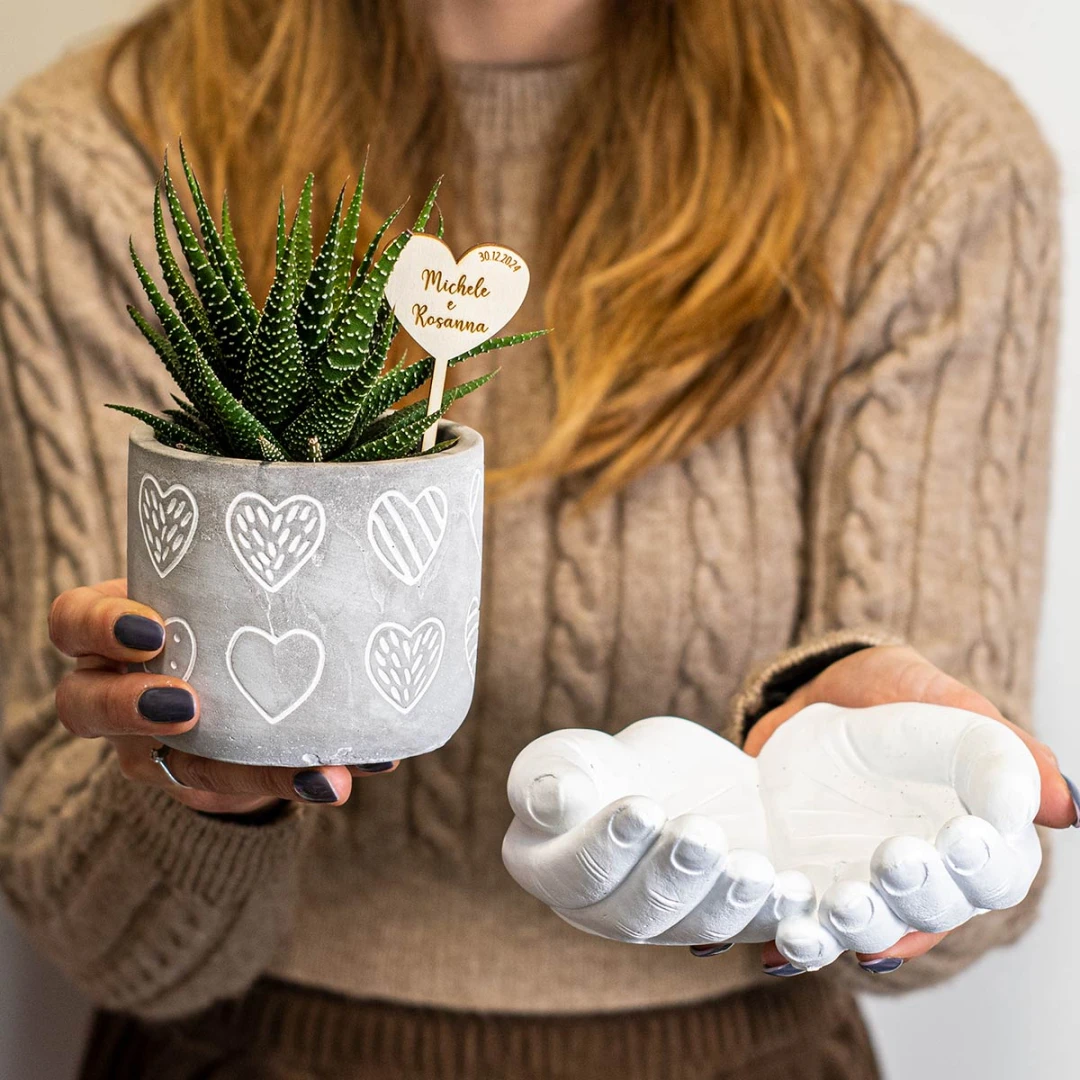 Bellissime Bomboniere 2026 Linea MILLE CUORI Vasetti portapiantina con mani e cuoricini. Disponibili in due dimensioni. Entrambi i modelli arrivano assortiti nei due colori mostrati. Prezzo cadauno. Prodotto Artigianale.