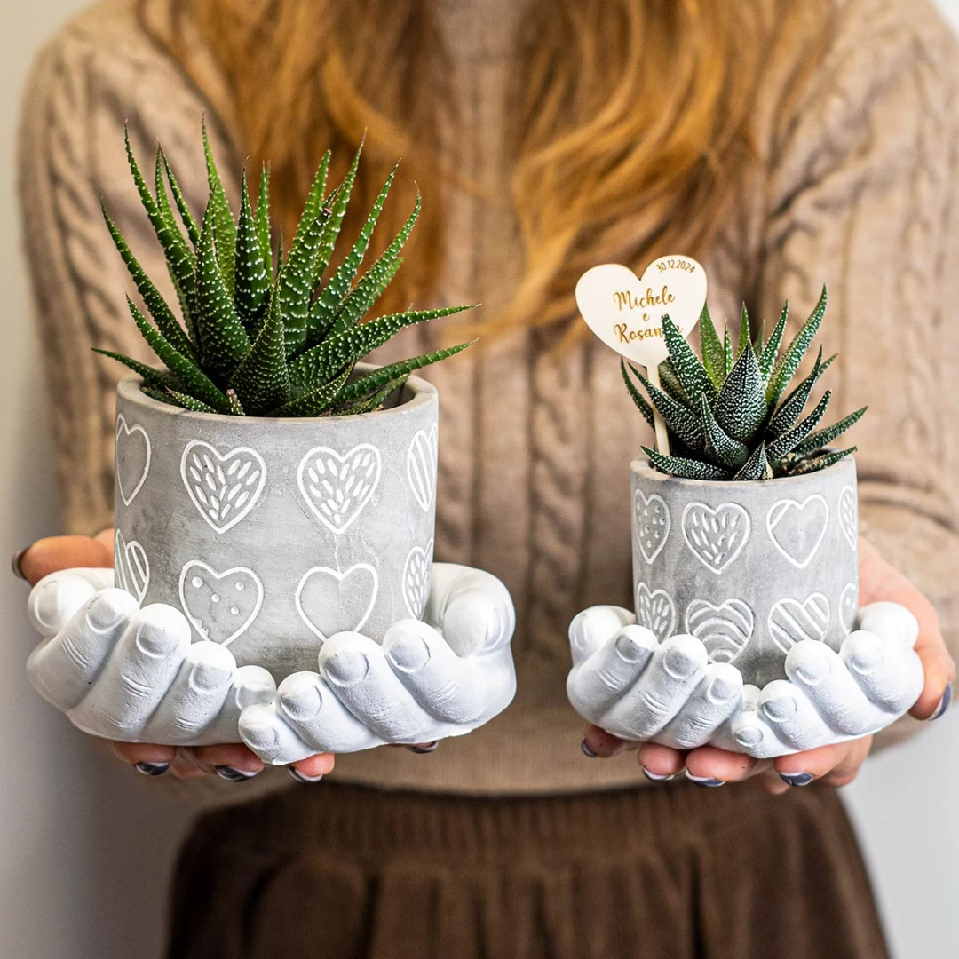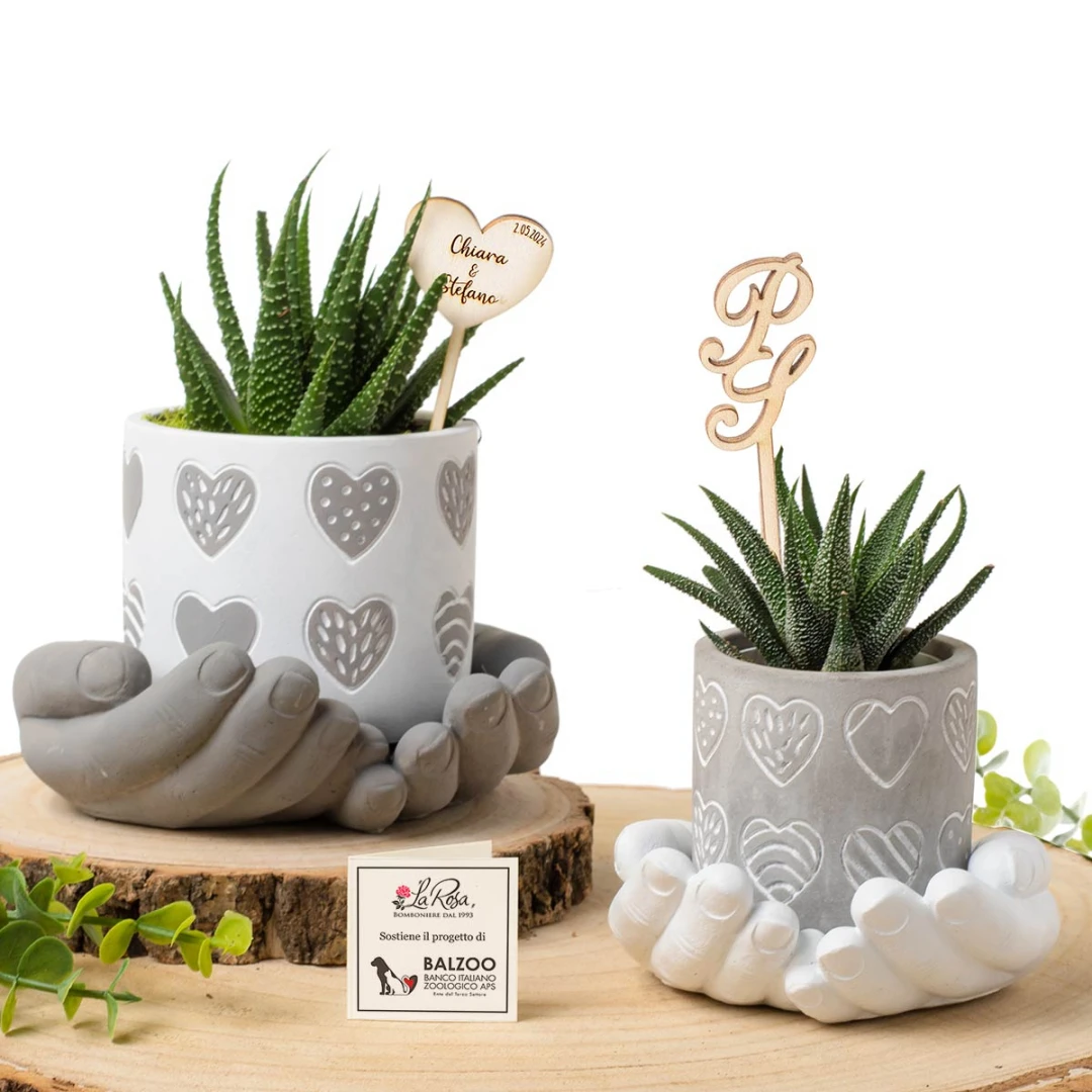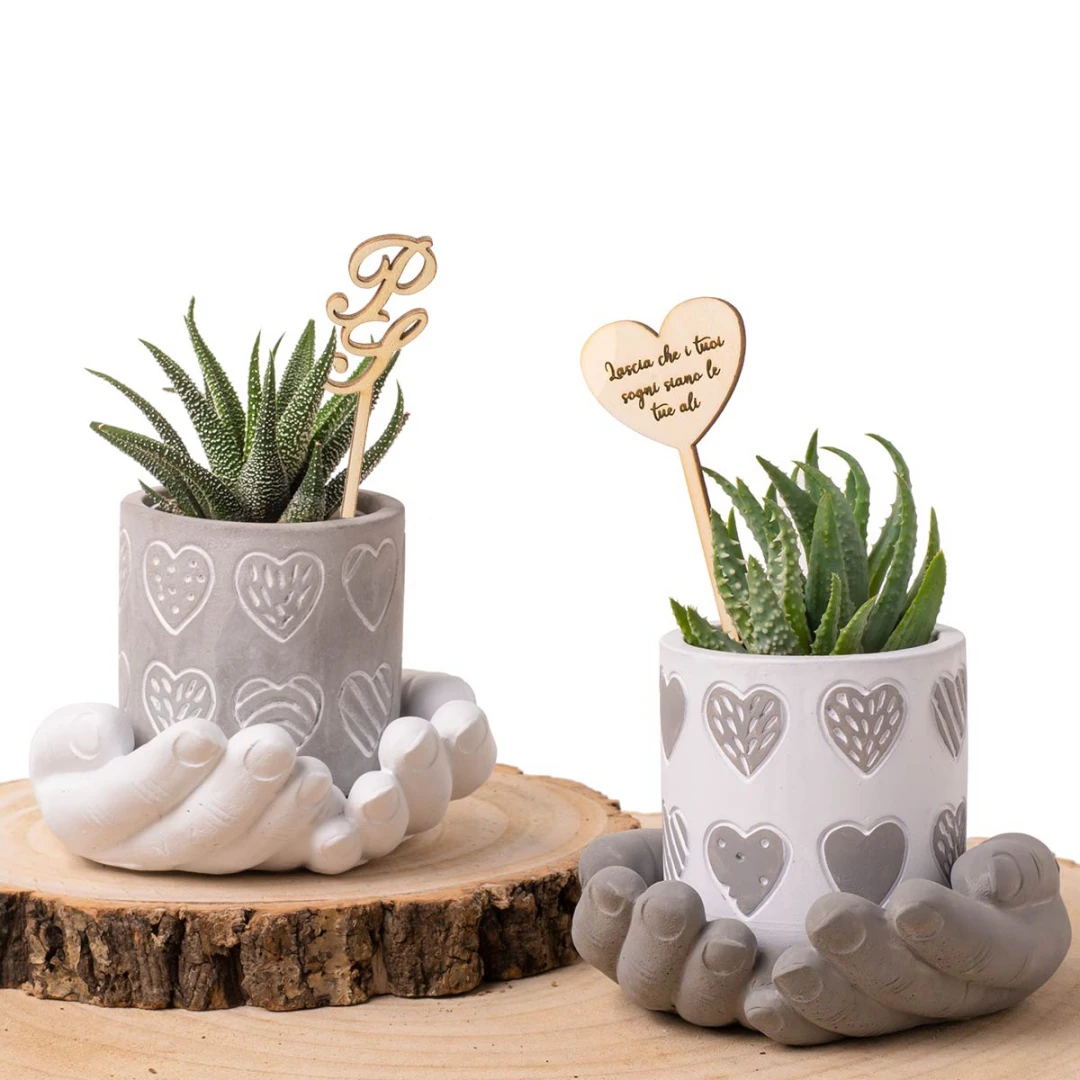 Bellissime Bomboniere 2026 Linea MILLE CUORI Vasetti portapiantina con mani e cuoricini. Disponibili in due dimensioni. Entrambi i modelli arrivano assortiti nei due colori mostrati. Prezzo cadauno. Prodotto Artigianale.