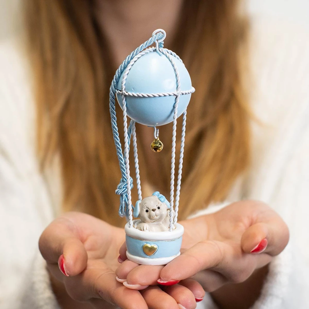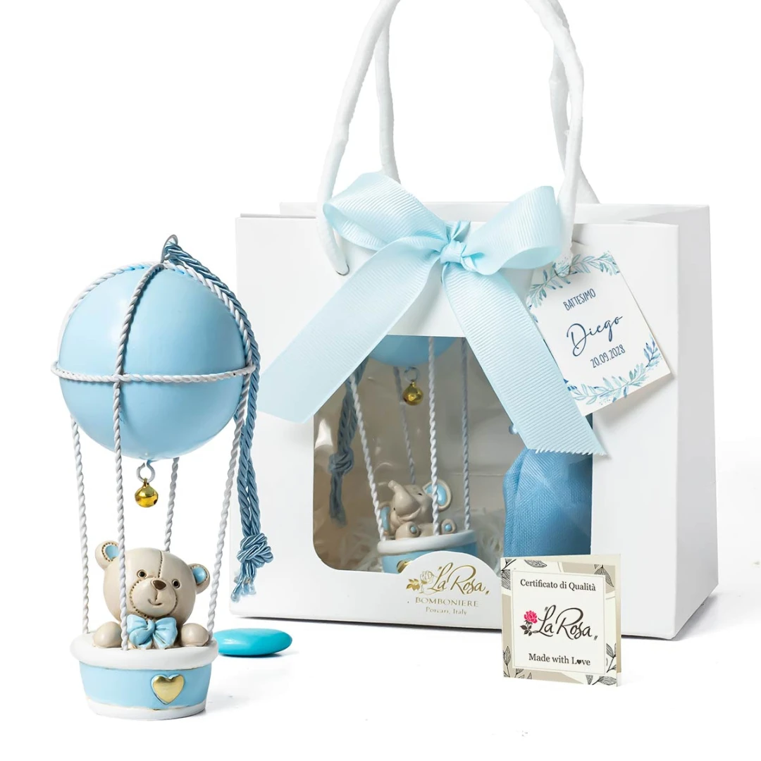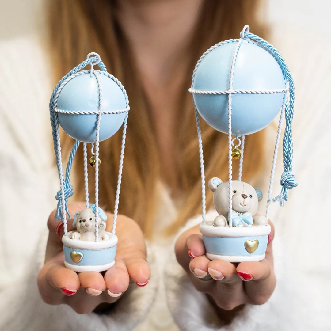 Bellissime Bomboniere Battesimo o Nascita Maschio 2026 Linea MONGOLFIERA Animaletti su mongolfiera celeste. Due dimensioni disponibili. Arrivano assortiti in 3 versioni. Prezzo cadauno. Prodotto Artigianale.