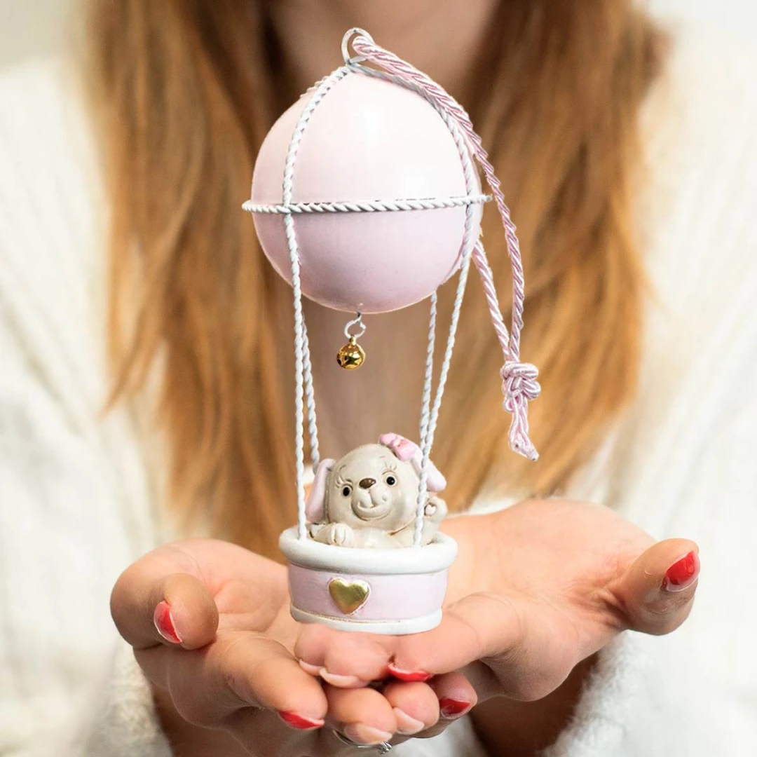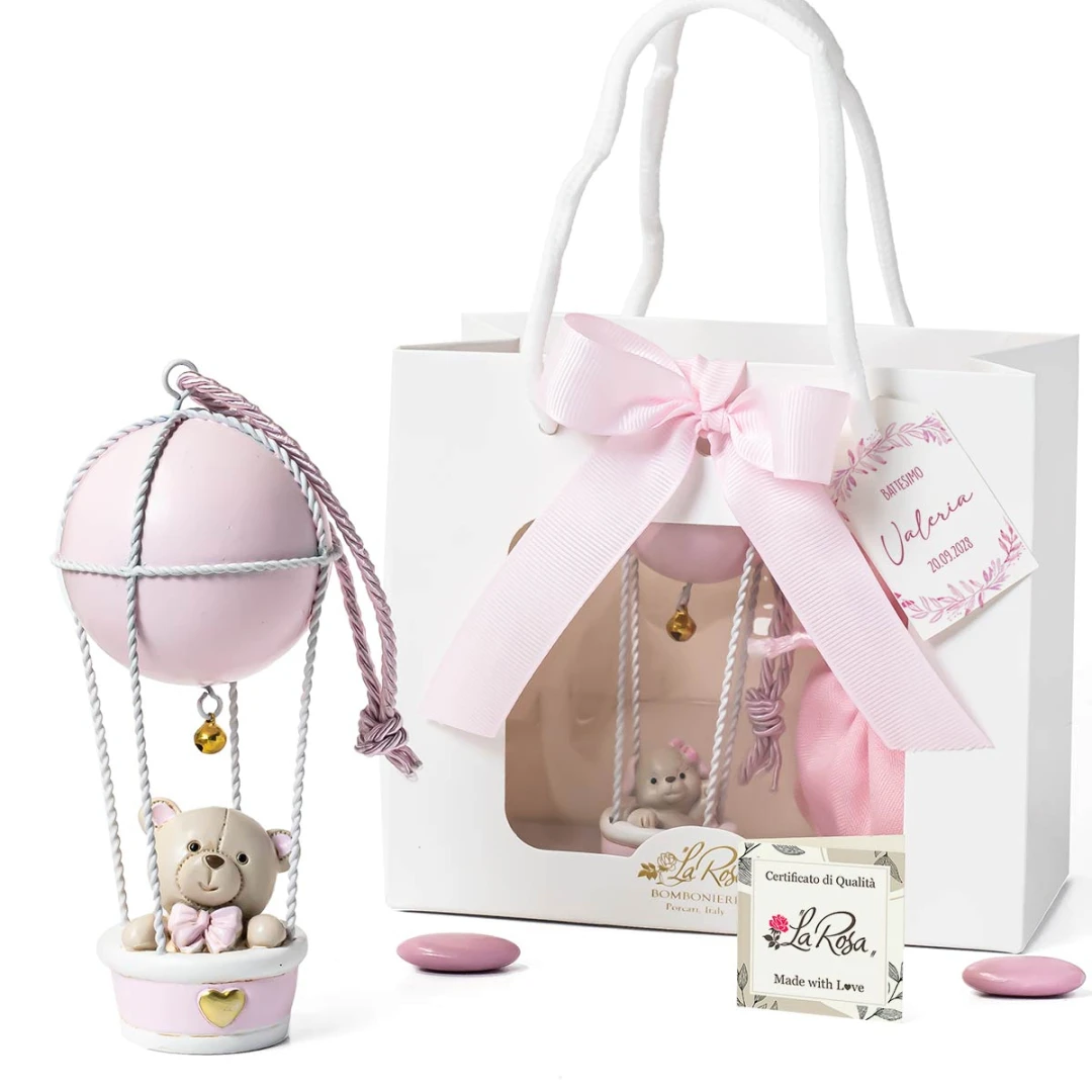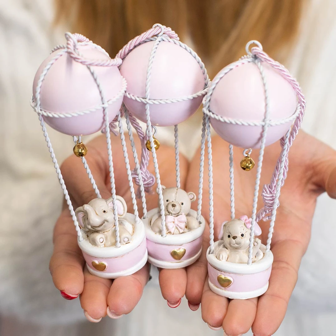 Bellissime Bomboniere Battesimo o Nascita Femmina 2026 Linea MONGOLFIERA Animaletti su mongolfiera rosa. Due dimensioni disponibili, arrivano assortiti in 3 modelli. Prezzo cadauno. Prodotto Artigianale.