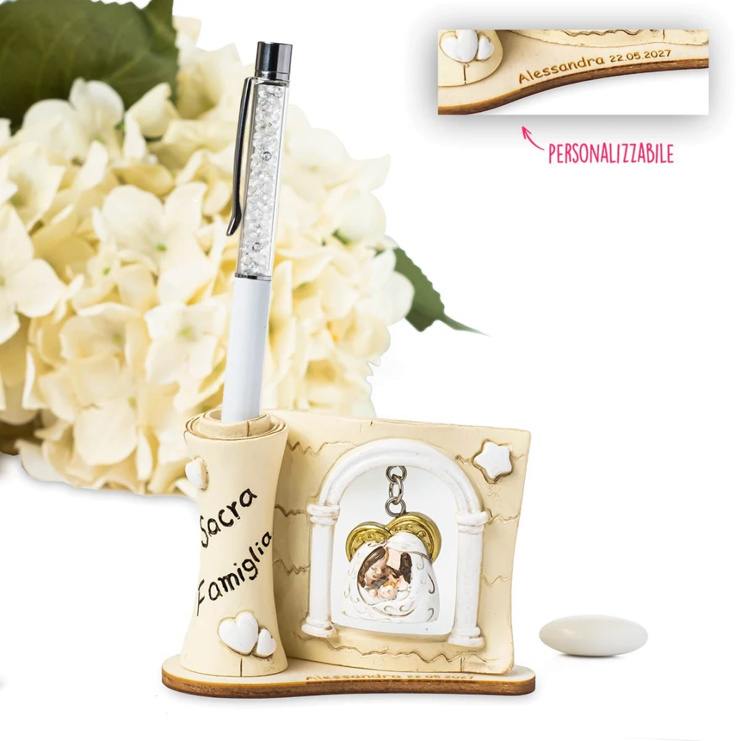 Bellissime Bomboniere 2026 Linea PENNA Icona Pergamena portapenna con penna e ciondolo sacra famiglia. Prezzo cadauno. Prodotto Artigianale. Misura: 10 cm | h 17 cm. È possibile aggiungere una base con incisione personalizzata.
