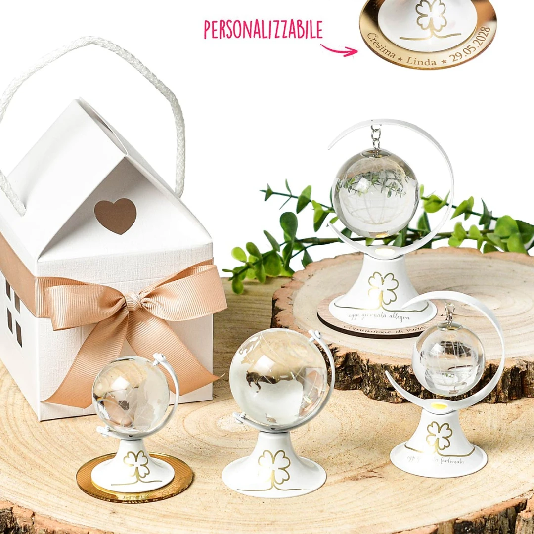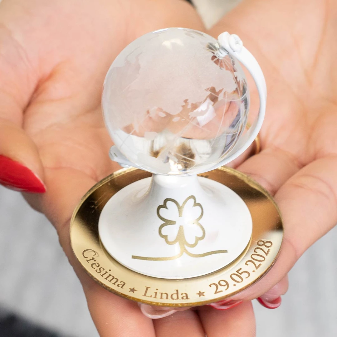 Bellissime Bomboniere 2026 Linea GLOBO Mappamondo con stand in metallo decorato e sfera in cristallo. Disponibili due dimensioni e modelli. Prezzo cadauno. Prodotto Artigianale.